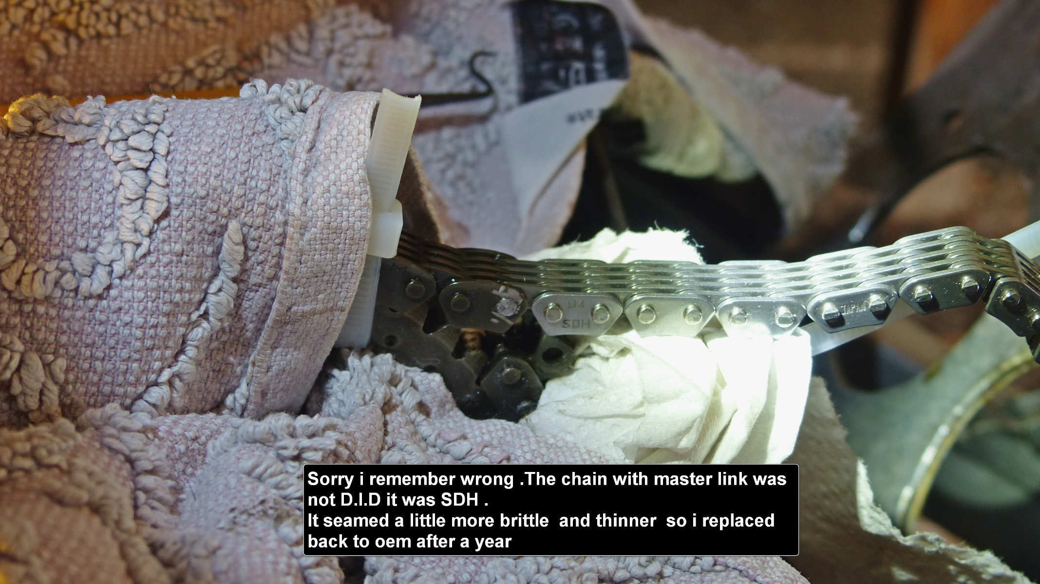 Sorry i remember wrong and thaught the masterlink camchain was a D.I.D chain i can se now when looking at the pic it is a SDH i measured it in many ways and it was a little thinner and on top it was flat the pins also was a tiny bit thinne i think .The oem chain is more bulky and on top it is bumpy. It worked ok , but i split the cases and replaced with oem a year later