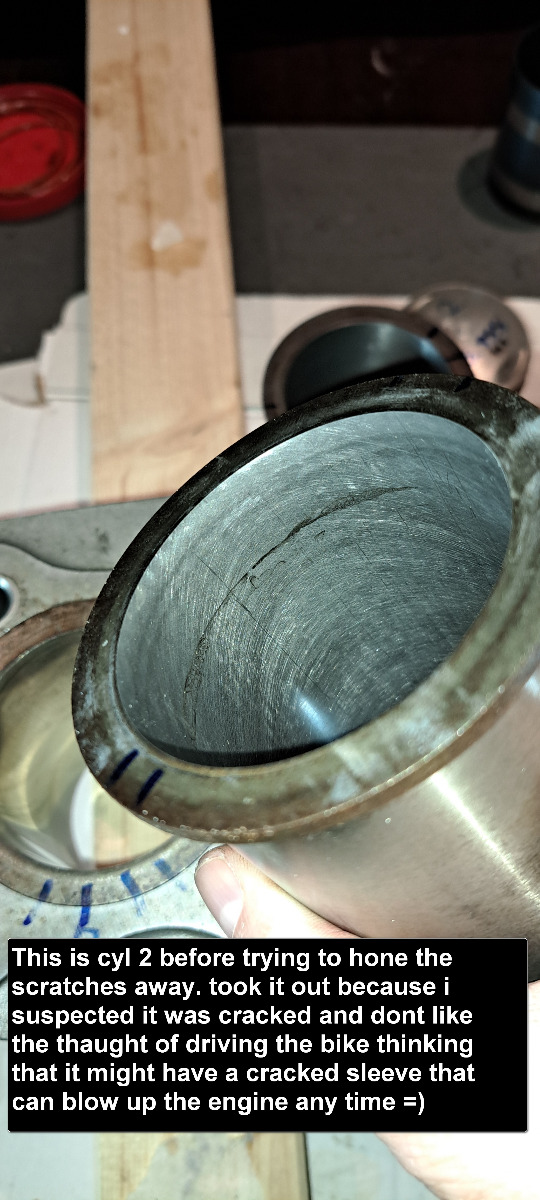 .Done a little more honing today to see if the scratches vent away.I measured the bores several times with the boredialgauge to check that i did not mess up.I was prepared to buy new sleeves anyway because i suspected