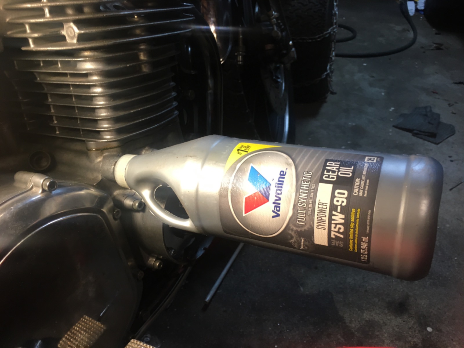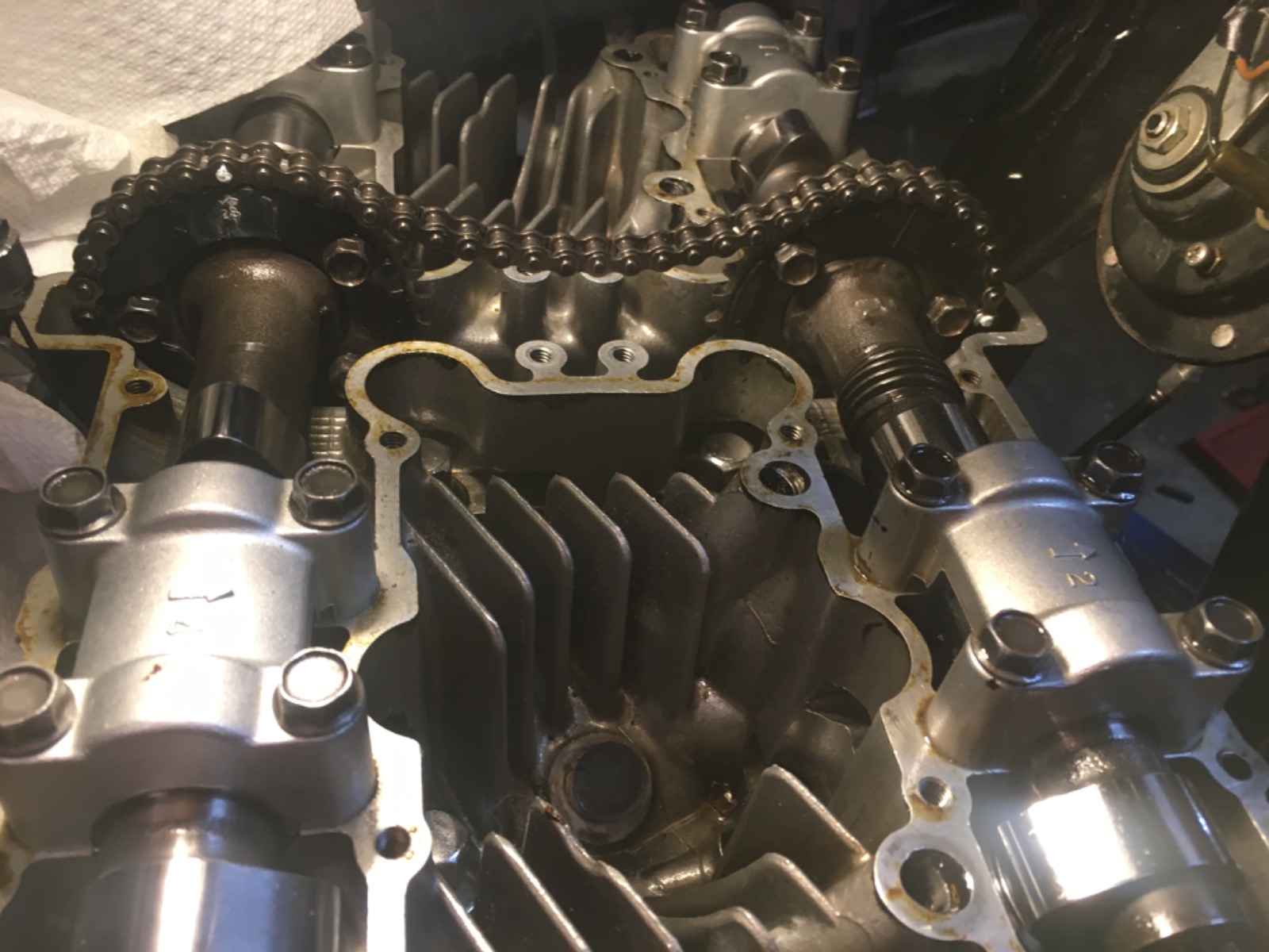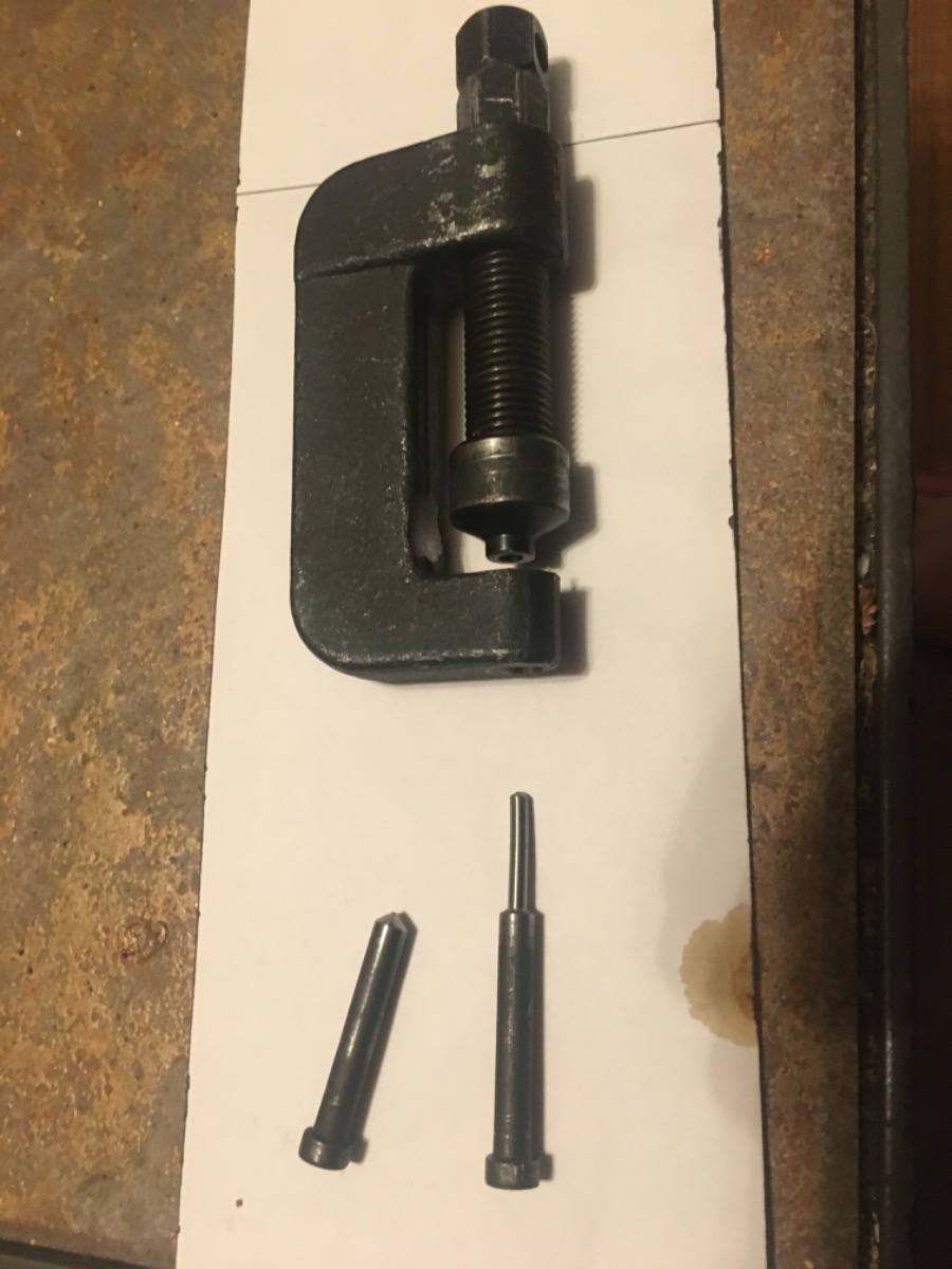 I got bored, so I thought I would post some stuff an old guy uses, and some basic stuff for new guys that probably been covered 100 times. There a good picture of 122 link chain setup in time and ready to go. Put crank shaft on 1-4 T mark. I put the cams through the chain pull the chain tight, mark the link that lines up with the valve cover surface and align the> mark on exhaust cam gear count 28 starting on next link above the> mark make a mark then align the intake cam gear 28 mark. Now, I don’t use 90w in my motorcycles. But if you clean out one of those bottles and put your favorite oil(not going down that rabbit hole) in it you can use it for many things. I use it in oil galley to prime new engine, check if oil is going up to the cams after a top rebuild, push old oil out and new oil in a old bike before starting. I sell that tool for $90 free shipping! Next is chain grabber made from coat hanger. I don’t tie the chain up on top end jobs it just gets in the way. I just let it hang out at the bottom till I need it and just grab it with the coat hanger.. Now the controversy about cam chains and continuous only or can a split chain be as good. I haven’t seen one come apart yet if done right! I use the D.I.D chain and rivet link. When I rivet it I use two modified pins in my tool. First one is the larger pin that kinda centers everything and opens it up. Then I use the smaller pin to go in and make it tight! I put a .010 “ feeler gauge between the links on the back side so as not get it too tight.. They just tell you to round the small pin on you chain breaker, so I thought I would show how my are. And just something I have noticed, the 124 link chains are more available and cheaper. So if your going break it anyways, just pull a whole link.. well if this is useless I am sure someone will get rid of it. But it gave me something to do. Thanks