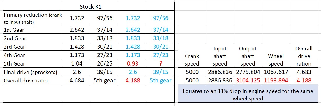 Just "spit-balling" here as I don't know if it would even fit but the below shows the effect of using a 5th gear set from a Z1300 (0.93) without effecting anything else through 1st to 4th