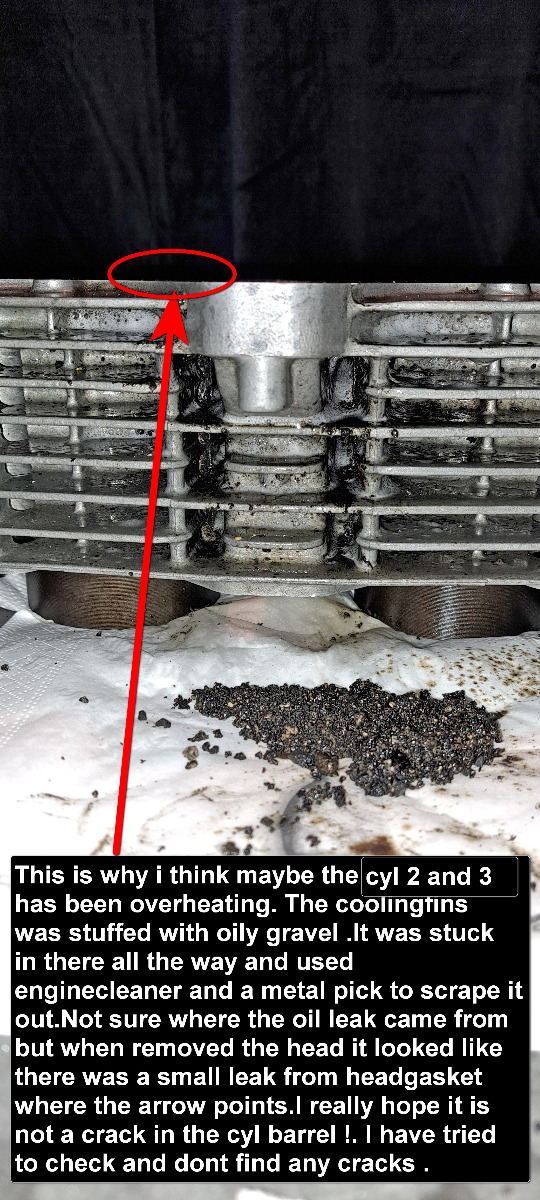 10 Dec 2023 04:32Might not have been the case here, but a tach drive leaking oil can mimic a leak in the cam chain tunnel O-ring area due to the way the oil blows back into that space while riding.Hi i am not sure why the head gasket blew ,but guessing to high compression and overheating on 2 and 3.About the cylinder holes that is clogged or not bored.On my 900 i had to use a metal pick and dig out a lot of gravel and dirt that was burned to a rock hard mass clogging the cooling holes.