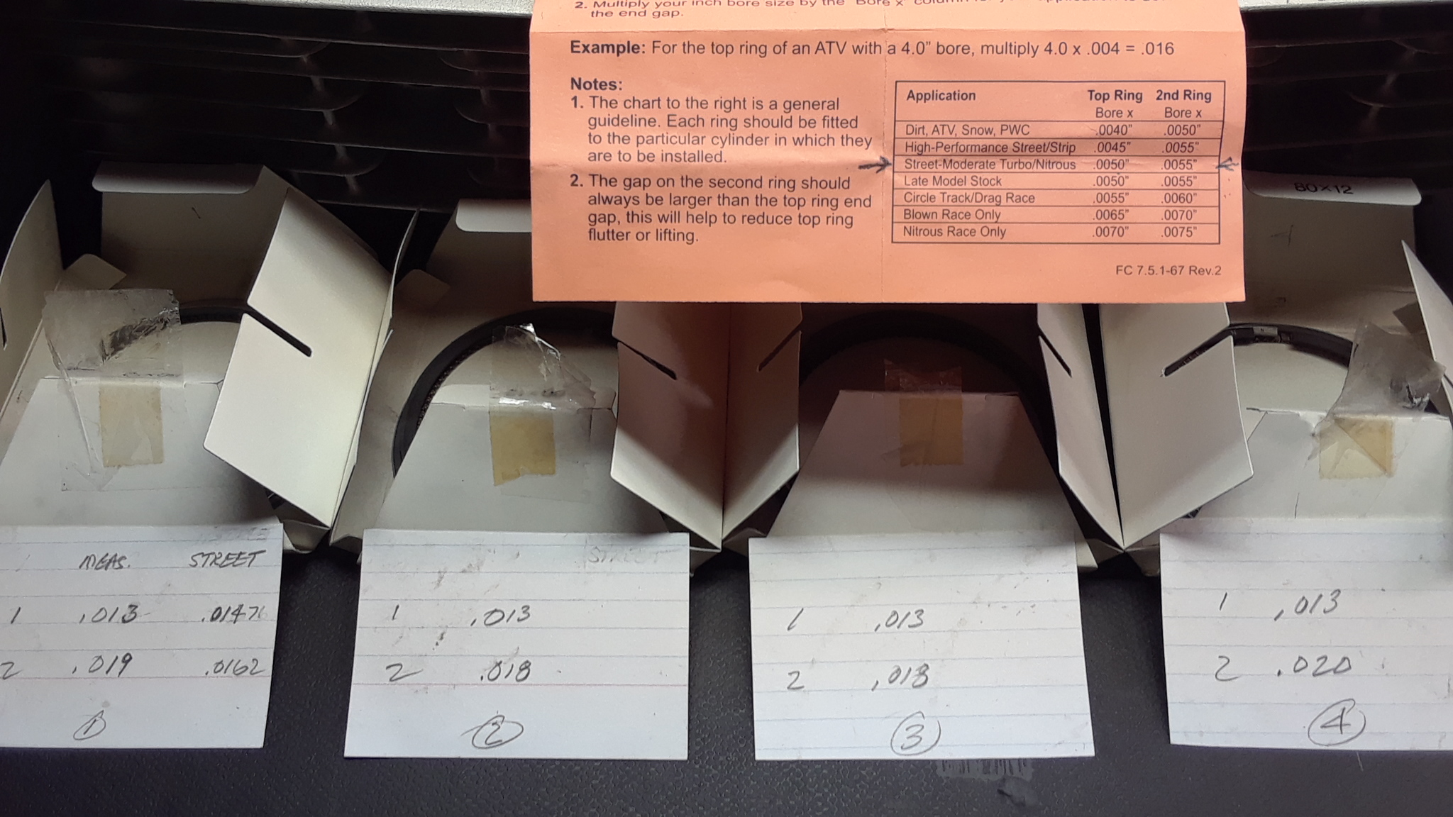 The top ring gap .013" (75mm/2.95" cylinder bore)