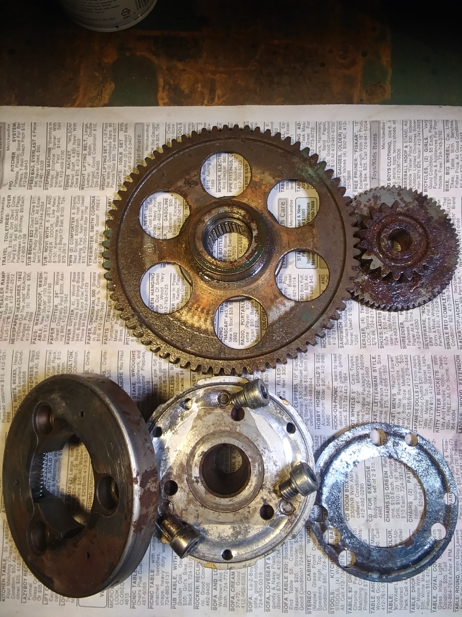 Thanks again to all for the help and great info. You guys really know your Kaws. Anyway the cam sprockets are 32 teeth so I'm quite certain it's a MK 2 crank. But after another look at the original starter assembly that I still have, the three bolts that hold the starter clutch to the rotor are sheared off. I think they tried to use that assembly with the larger motor (1327cc) and crankshaft. and it failed. I was then given the option of an outboard starter, or to kick start it. Anyway hopefully a MK 2 starter assembly can be fitted. Also a pic of a heavy duty starter that Pogue Racing used to sell from there catalog back then, maybe there's some still around ??