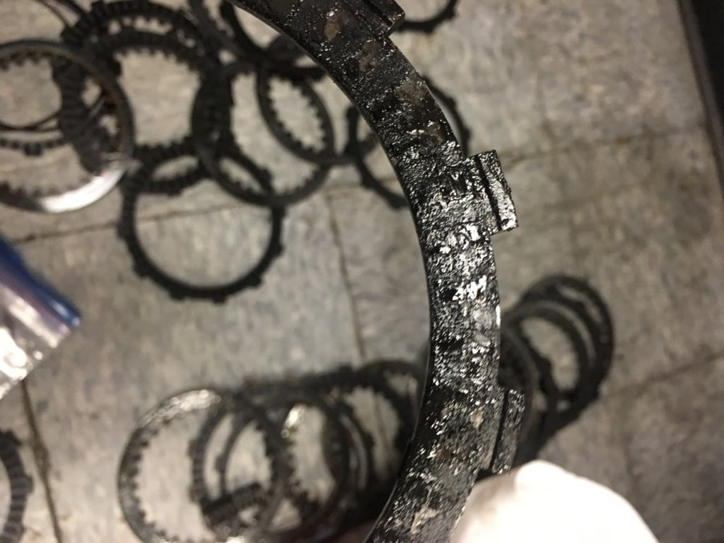 That clutch plate looks to be disintegrating. Not the common glazing problem that occurs with clutch plates when friction modifiers in an oil damage the friction material.