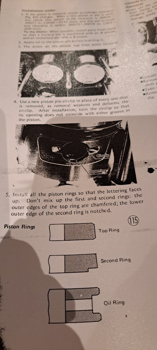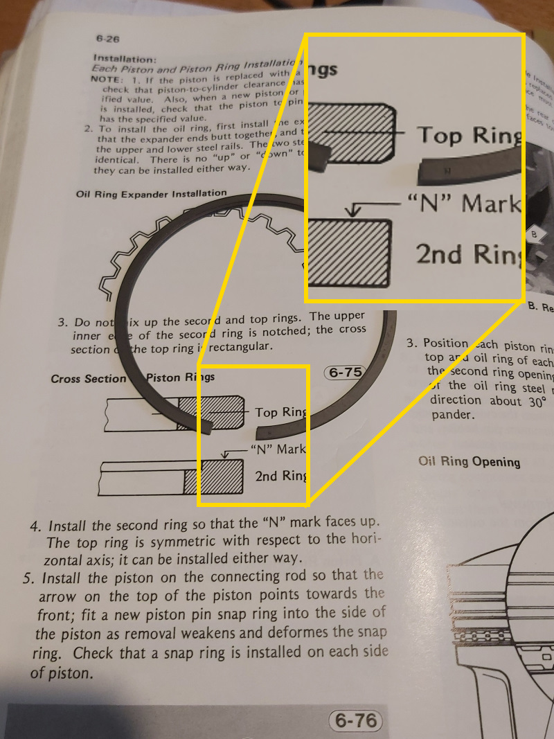 Just to add If the second ring is placed upsidedown i will push oil upward instead down to crankcase.The ring has a chamfer / angled edge to keep it sharp as the ring wears into cylinder wall. If the ring is worn the chamfer /angle will be gone and the edge of ring gets 90 degree straight .If you placed the old rings into the bore again and also did not deglase the bore it is very big chance that it will be a oilburner.Thing you should do is measure the bore for taper and out of round and piston to wall clearance. If you are lucky you can just deglase the bore with a ballhone or / stones put new rings on and ride.If you dont have a boredial gauge you can buy a set of new rings and put them in the bore and check that endgap is in spec or at least close to spec.The piston to wall clearance can also be measured by using feelergauges not 100% acurate but it works.I did check that when i rebuildt the kz900 engine.I also used a boredial gauge but for fun checked if the feelerblade method is usable and it is ,for piston to wall clearance but not for measuring out of round or taper