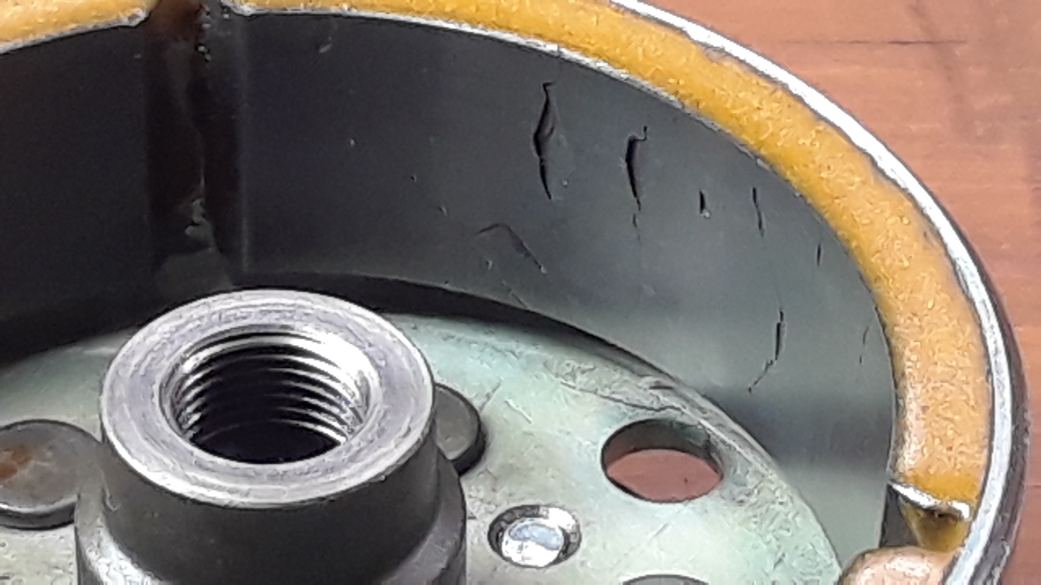 Something caused the spinning rotor to make contact with the stator, and the impact left a visible crack in the steel housing behind the magnet.