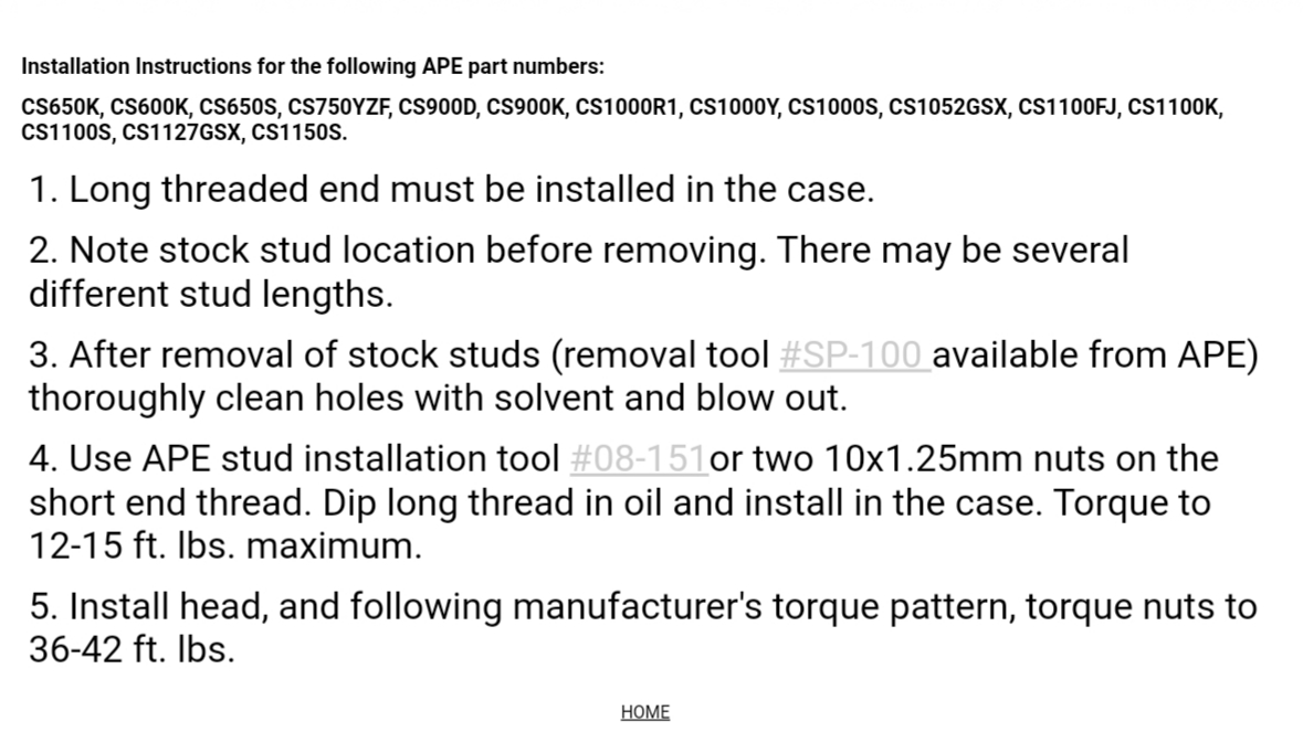 When (re)using Kawasaki factory cylinder studs 29 ft. lbs. is the specified torque, but with APE (Heavy Duty) studs 42 ft. lbs. is acceptable and recommended for this KZ engine model per the APE website