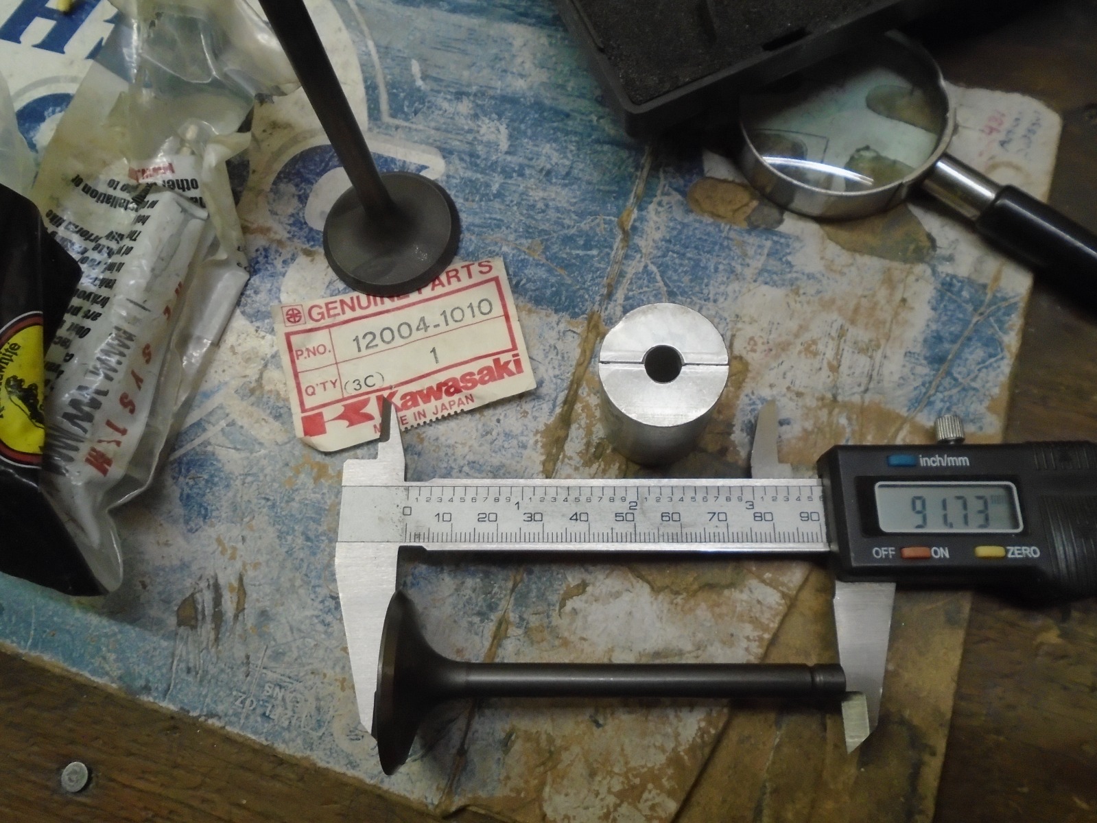 Ditto what everyone is saying. Things that might be useful though. Check the top of suspect valves, look for some manufacture markings. Aftermarket ones tend to be longer overall length. One shown with marking is a K&L, stock valves are smooth as shown next to it. Also note spring keeper style, Very important!! Don't want to match the original "square" keepers (2 per valve) with round milled valves. I always use the later 77-up KZ1000 round keeper valves, intake and exhaust, when doing Z and KZ900 heads. They might of "faced" the valves too much, look for a sharp/missing margin. The tool Crazy showed is super handy and number 1.110 stamped on top is the stock base circle of all the KZ camshafts. You have to remove valve seal and valve spring seat to use it, sits flush on casting in valve bucket bore. This allows approx 37.25-37.95mm valve stem height above bucket bore floor. Within that approx .7mm range comes your shim selection. You really should have a machinist capable of doing the "final height or tipping" the valves if You're not capable of doing it yourself. They need all your stuff to properly do it