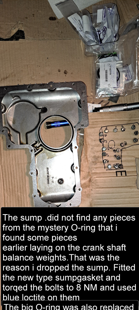 I used a little blue loctite and 8 or 9NM on the sumpbolts and a cardborad to se where they go since they have different lenghts.I post some pics from when i did my engine.Notise the nwe oem sump gasket is different it does not have a crossover part .