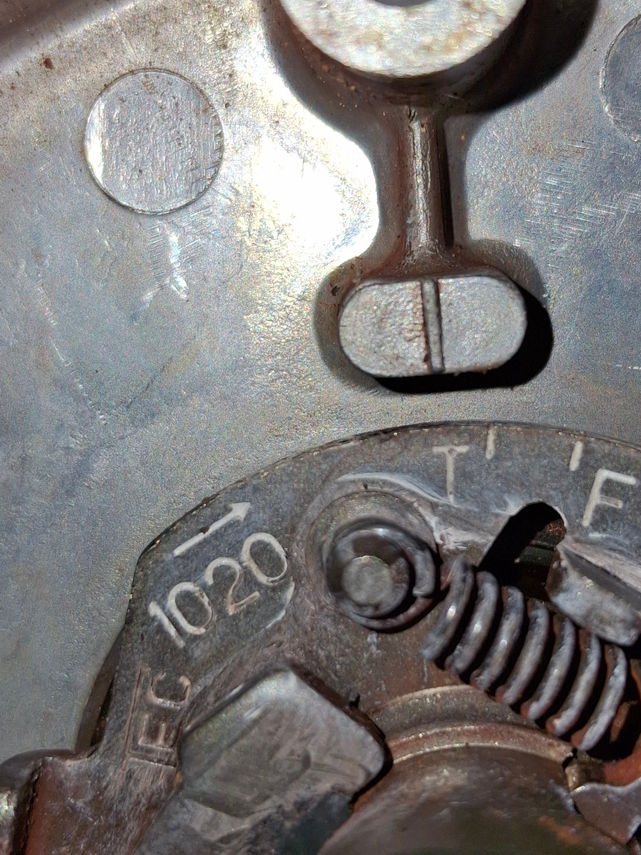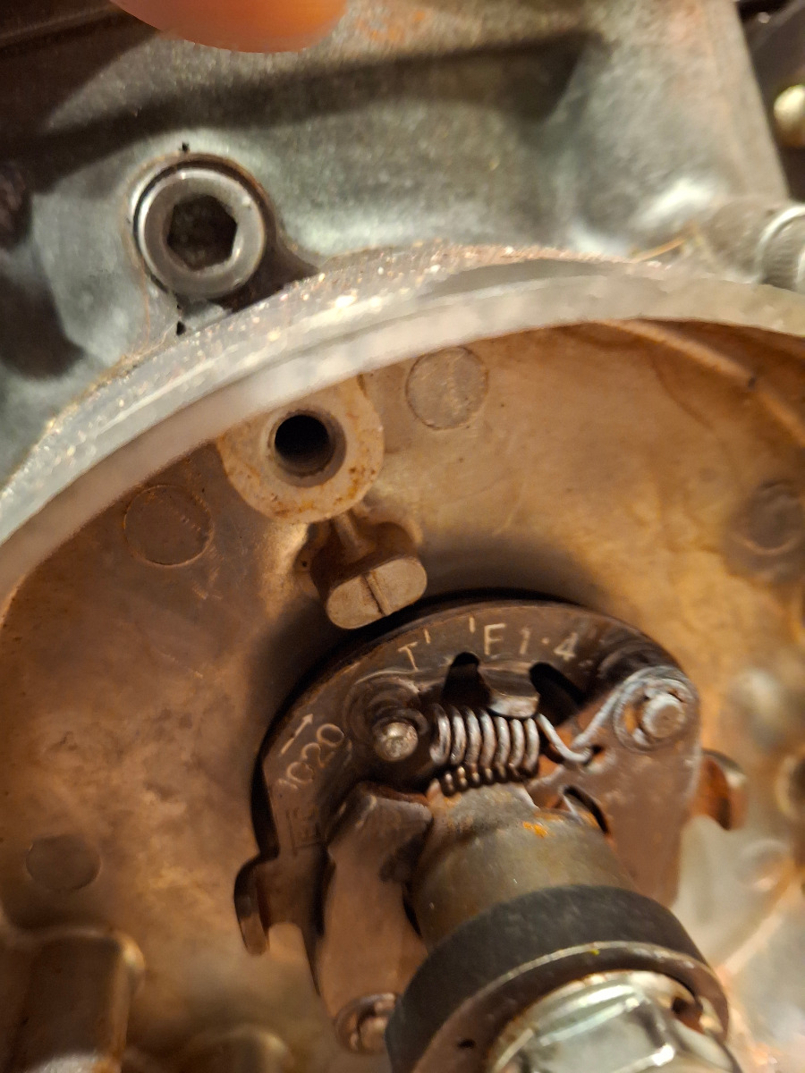 The rust is locking the timing advancer movement, a good clean and some lube should help.