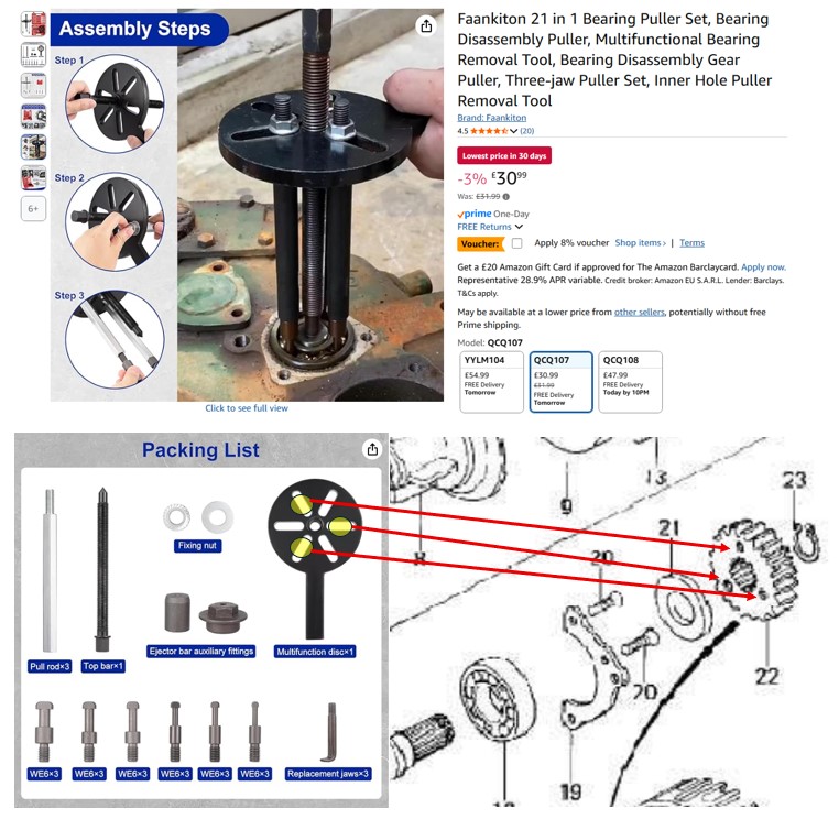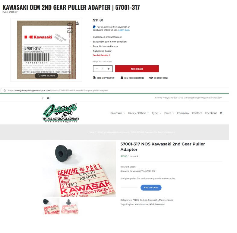 10 Jun 2025 02:36 - 10 Jun 2025 03:16You need a "three bolt" puller to remove the gear (OEM parts puller 57001-319 and adaptor 57001-317) the adaptor 57001-317 is available from Partzilla and Johnny's and is cheap (as I understand it the adaptor fits between the puller bolt and the shaft to prevent damage to the shaft) you can use a generic "3 bolt puller like the one below as the OEM one seems to be unavailable. The diagram also shows how the three bolts attach the puller to the gearI have read trought the document: