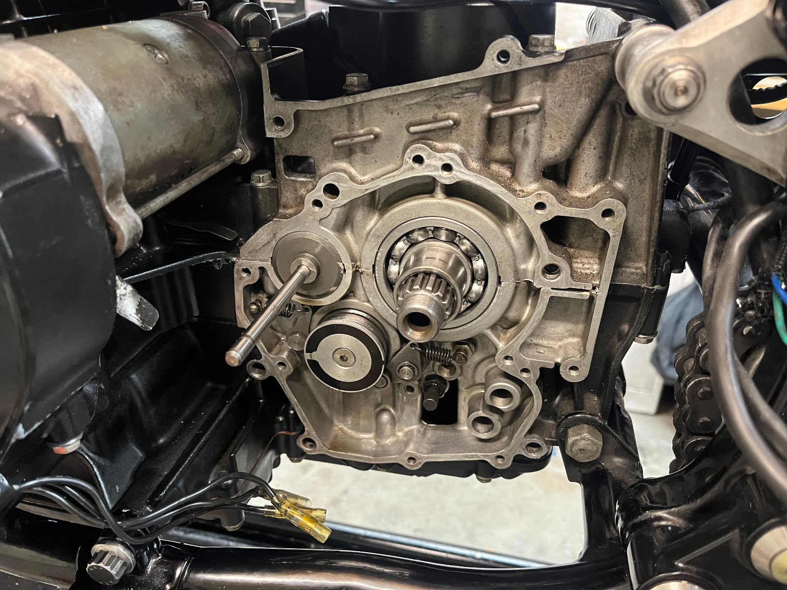 The output shaft bearing failed on my kz1000. I pulled the engine, split the cases, replaced the transmission bearings, and cleaned it up. I now have everything all put together and engine is back in the frame.