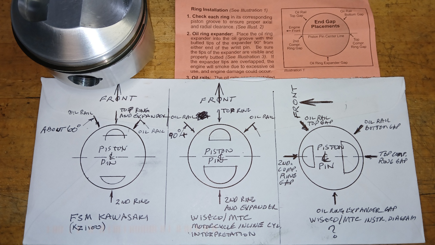 I always use MTC's ring install instructions, never had a issue. The majority of my big bore kits have been MTC, a couple of Wiseco's and JE's. Since my first bore kit was a MTC I always revert back to those instructions even if re-ringing stock Kawi pistons.