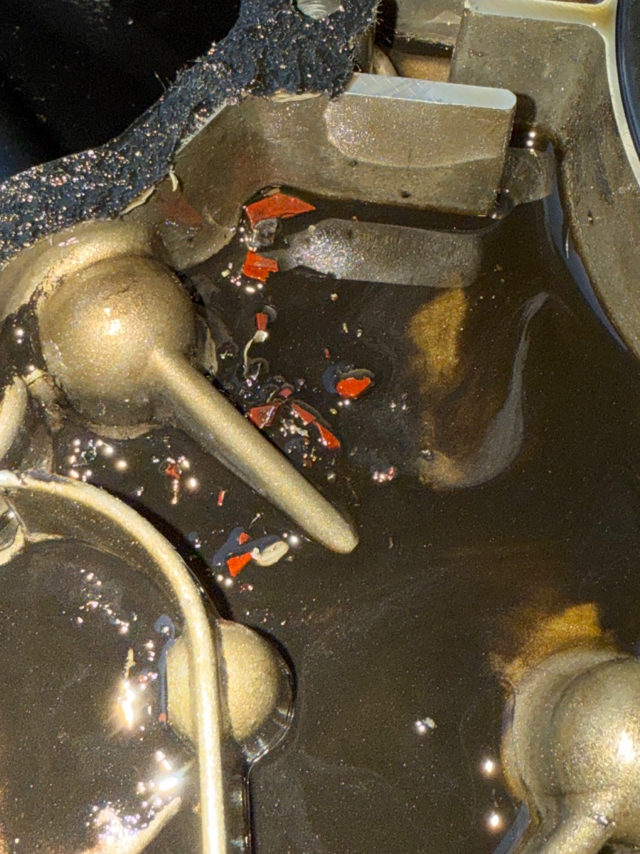 Treasure number three is paint flakes sucked up into the oil pump strainer, I’m assuming because Kawasaki painted the inside of the Spectre oil pan that sweet ass gold color just like the outside.