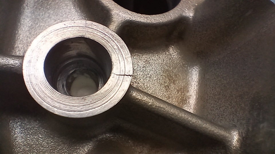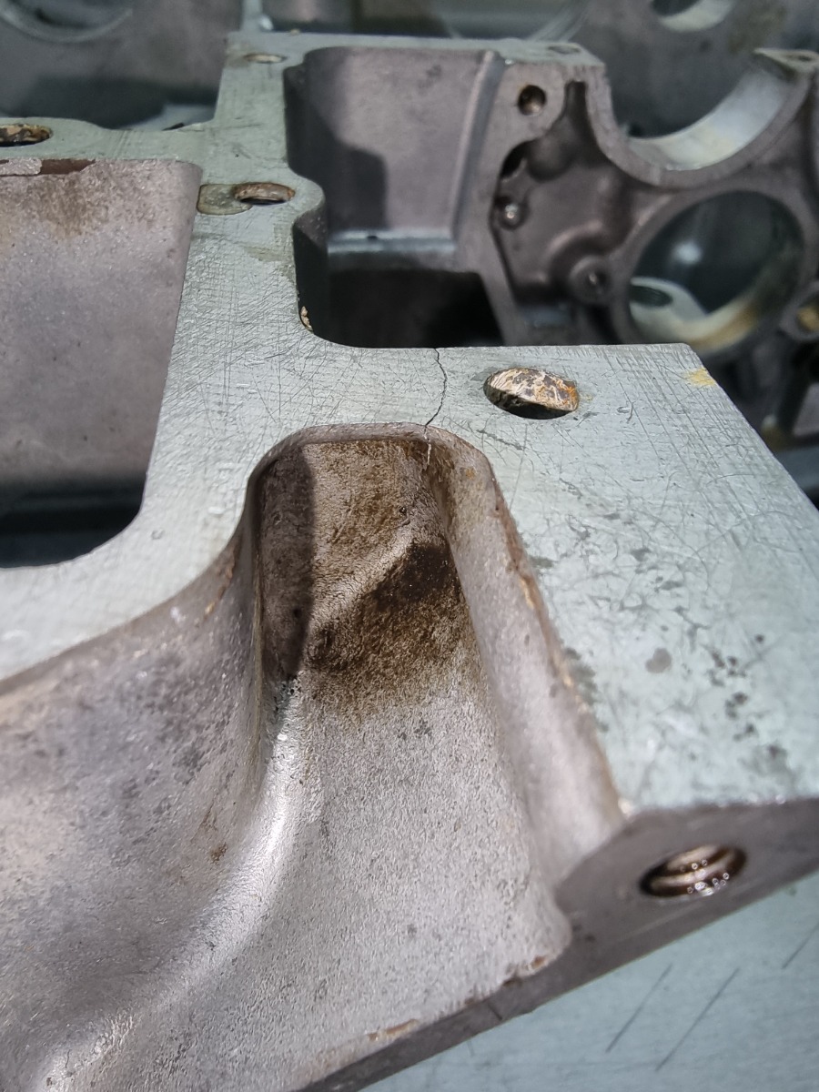 The crack where the bearing sits is due to the dowel being forced into the case and the other due to flexing of the cases when the case bolts were tightened.