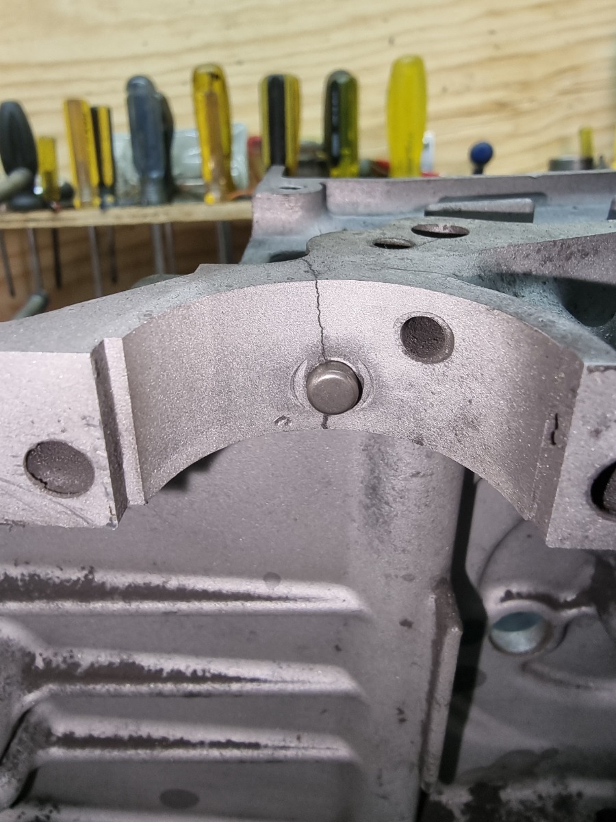 The crack in the bearing saddle will be blanked by the bearing itself, the trans gasket and will be closed further when the case bolts either side are tightened.