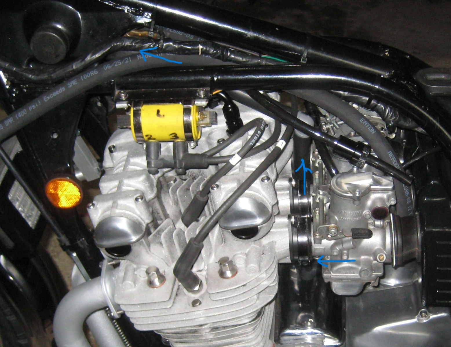 I don't have great pics of the install. That engine was pulled and a 1197cc Z1 replaced it with a different vent system that has two lines terminating into a ABS pipe.