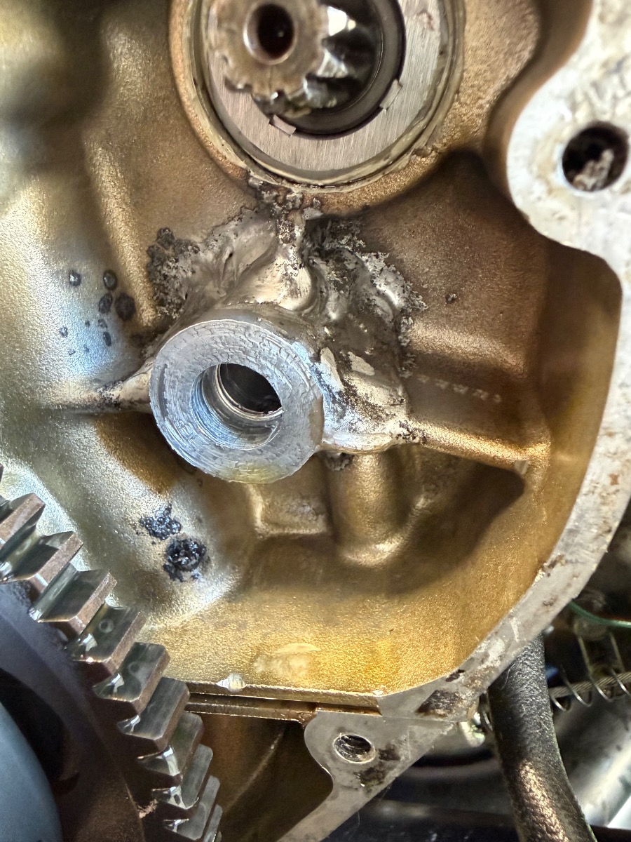 I’m replacing a leaking alternator gasket and I pull off the starter reduction gear and see this mess. It looks like the case broke and someone blobbed it back together. I’m pretty worried about it, I’ve dumped thousands in parts on this bike already.