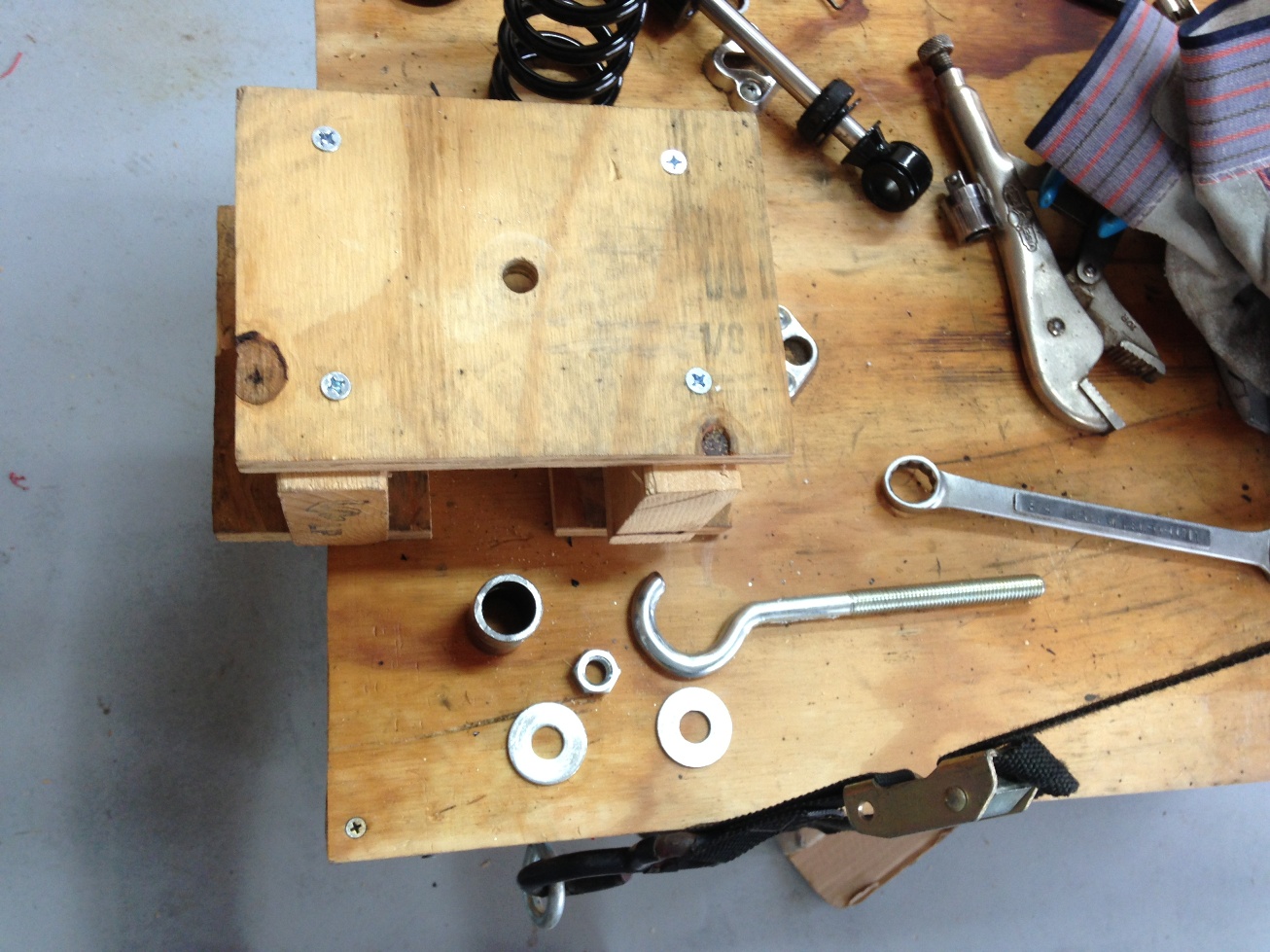 This is a pretty down-n-dirty spring installation tool that I knocked together this afternoon. If I was going to do lots of spring installations, I'd buy the real tool from Progressive, but for occasional use this worked fine. $30 stays in my pocket :laugh: