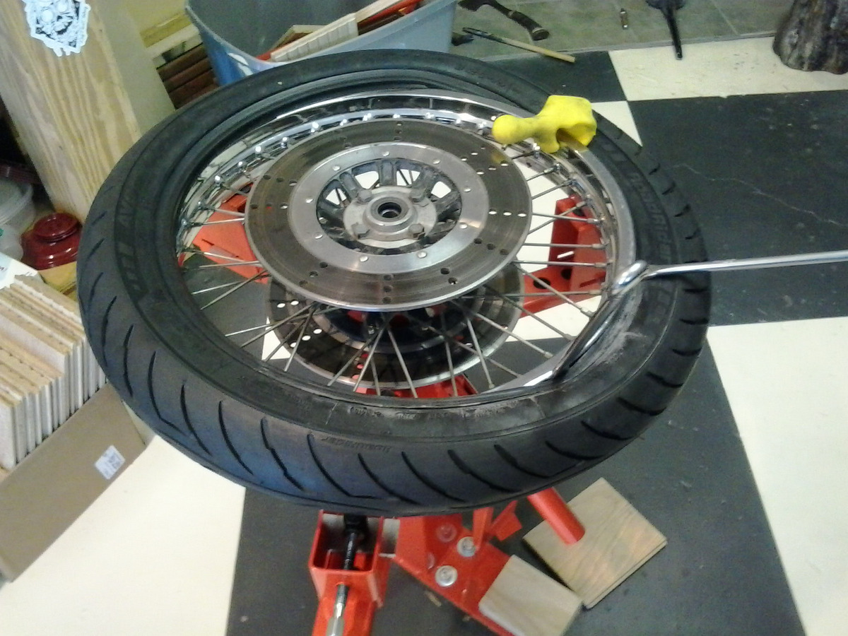 using the Thing to hold one side of the tire in the low part of the rim and working your way around with a good set of spoons is key.