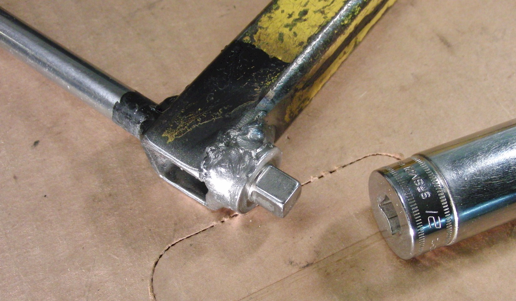 I found some ball-bearing rollers to use as the rotating handle, then just slid on a piece of PVC as a slip grip for the shaft. The socet is held to a 3/8" u-joint which is welded to the shaft.