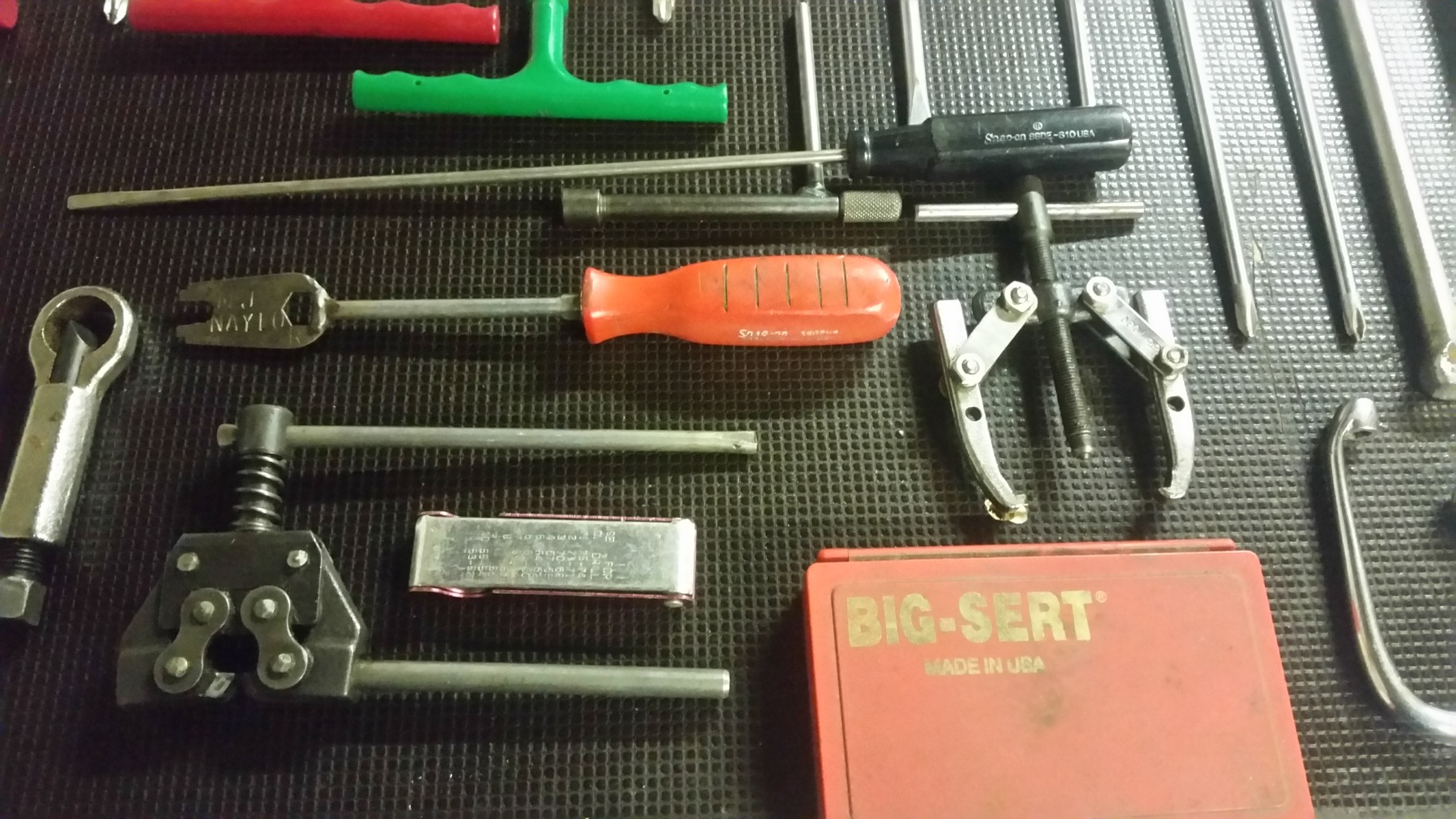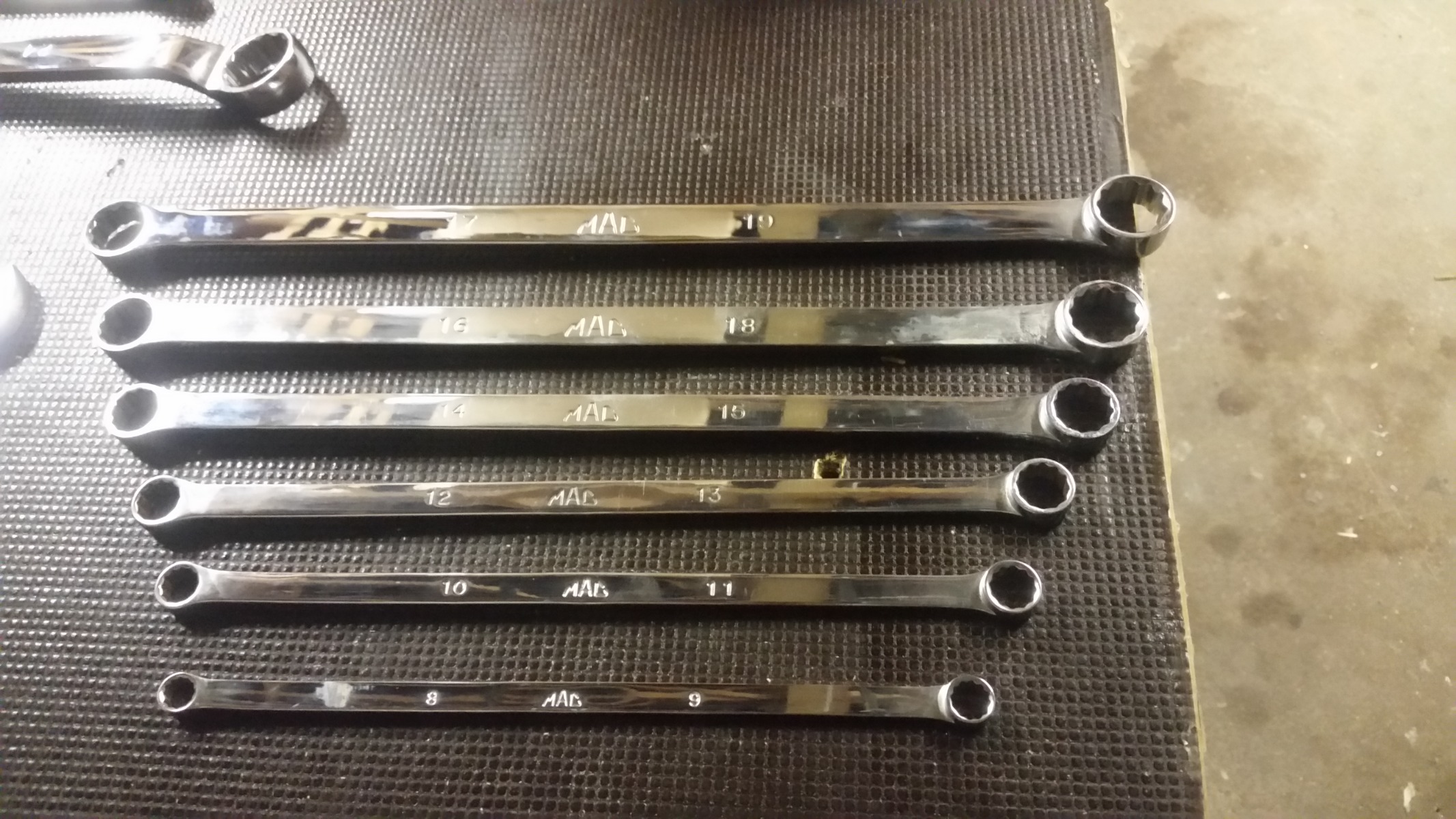 it's all part of a bereavement sale, my friend dougie sadly died age 83 in April, he was a gifted mechanic and a kawasaki man from 1971, he worked for kawasaki until 1984 then set up his own business as a kawasaki specialist in 1984 through to 2010, I really miss him and I'm trying to buy all the tools I can to preserve them and look after them the way that he did, he was a big fan of mac tools, I'd say I've bought 20% of his workshop so far. ..there's only so much I can afford at one time! I organized and polished up a lot of these tools yesterday, here they are....!