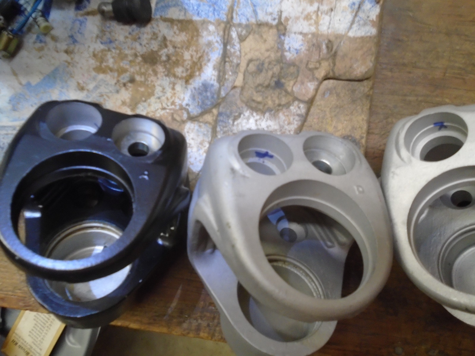 Not here to steal Grump's thunder, just a buyers guide Joe. The 76-77 B LTD and A Standard 900 calipers were pretty much identical and can be interchanged. The subtle difference between early and late was the milling for the "slug" opening. Early was a single milling, late two step. Bigger opening for the two-step for easier insertion of forementioned slug without scraping off the black finish. The KZ1000 1978 started using the "Soft" line with banjo fitting on top also had the two-step slug opening. The LTD Double disc used Smooth holder brackets where the Single used a dimpled plate. Both were hard lined but LTD used the "S" lines as shown in photos. Both used the Piston with the domed slug and retaining ring. Brake puck for this type of piston cannot have the shim attached with those two rivets, interference with dome and you'll smash the rivets. I have globs of these of course but Grumpy (Chris's) inventory should be depleted first out of courtesy. One advantage i do have though is all my stuff is already taken apart and checked for reservice. Just a what's what for shopping, hope it helps! Clay