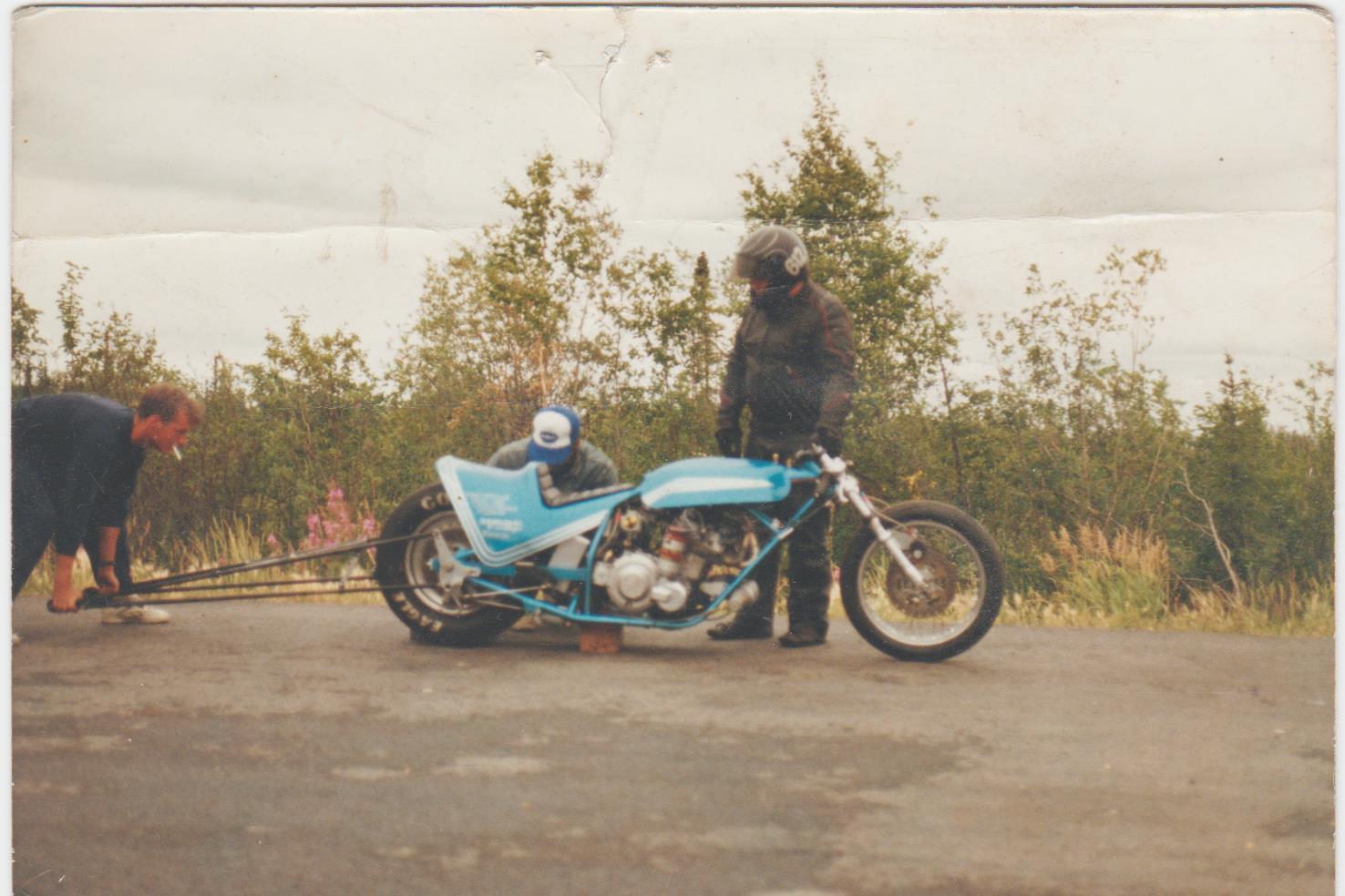 I owned this bare frame back in the 80's. This was taken after the annual Fairbanks Alaska drag races, on the way back to Anchorage. Fairbanks would shut down one of their main streets and set up the lights and let the drag racers have at it. Good fun back then.....