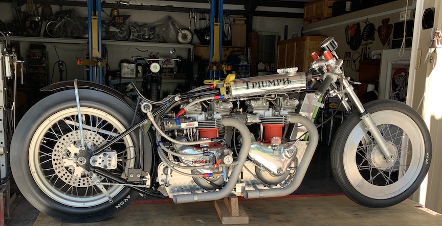 This is a Chevy powered drag bike from the late 50s. I found it while looking for some part for a Vincent drag bike I was restoring. I got to meet some of the guys who built and rode it. Some cool stories.