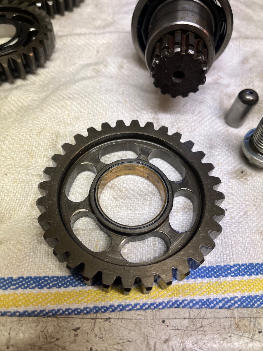 Hello. The best solution is to use the gear stack from a 600ZX secondary shaft. The 3rd and 4th idler gears rotate on a ring and not directly on the output shaft. The 600 shaft is longer than that of the 400/500/550, but everything fits together. The 600 primary shaft is identical to that of the 500/550. Only the bushing at the end of the shaft isn't drilled to allow for the clutch rod. With this improvement, the output shaft will no longer be cut by the gears rotating on it. Text translated from French with Google Translate, please be kind.
