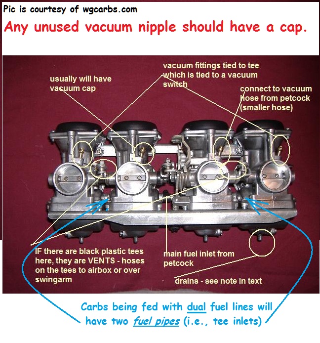 On models with two fuel inlets, there is a solid tube between carbs two and three. There is a fuel T between 1 & 2, and another between 3 & 4. A fuel line from the petcock goes to each inlet.