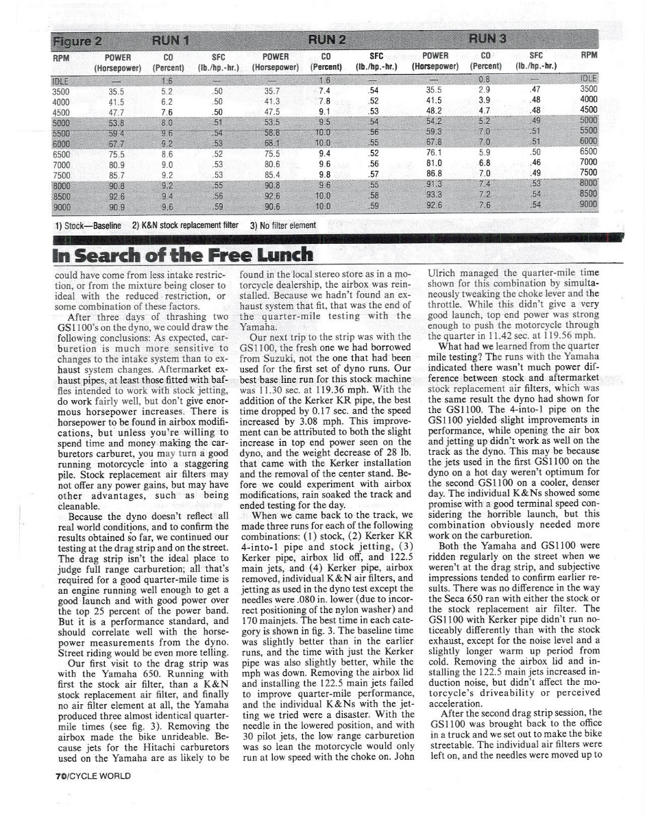 I never rode any GS1100 that wouldn't out accelerate a GPz11 in roll on tests like that...what a joke :lol: While I won't argue totally against the concept of the article because I still feel mucking around with CV carburetors & pod filters without a jet kit is a total waste of time. There are significant flaws in the testing. Had they done 3 runs for each test criteria it would have better validated the results where differences in HP were minor.