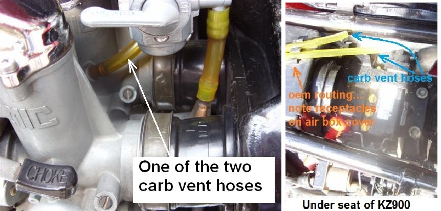The hoses may be routed to exit underneath the bike, or as in the KZX900's stock routing shown here: