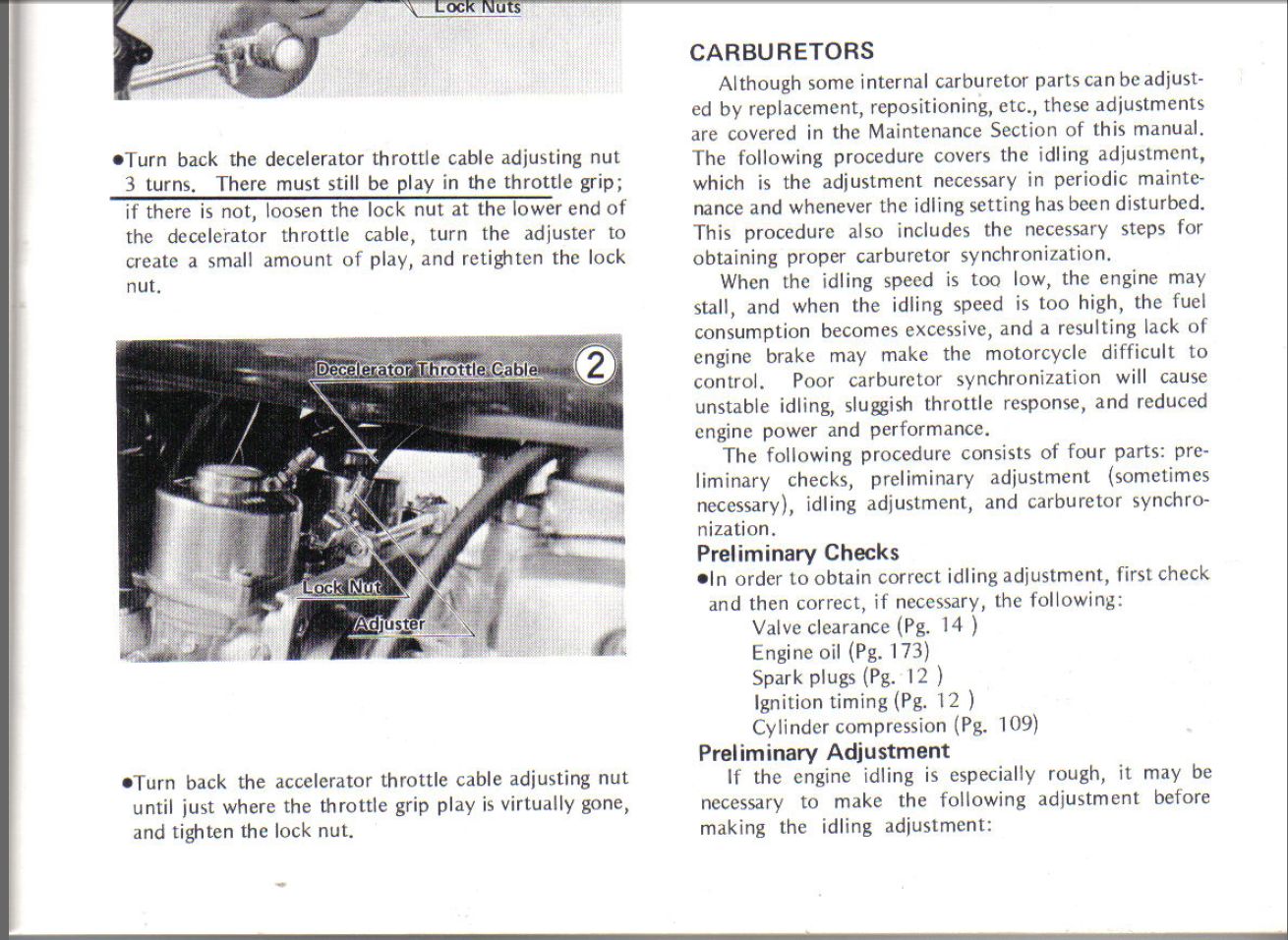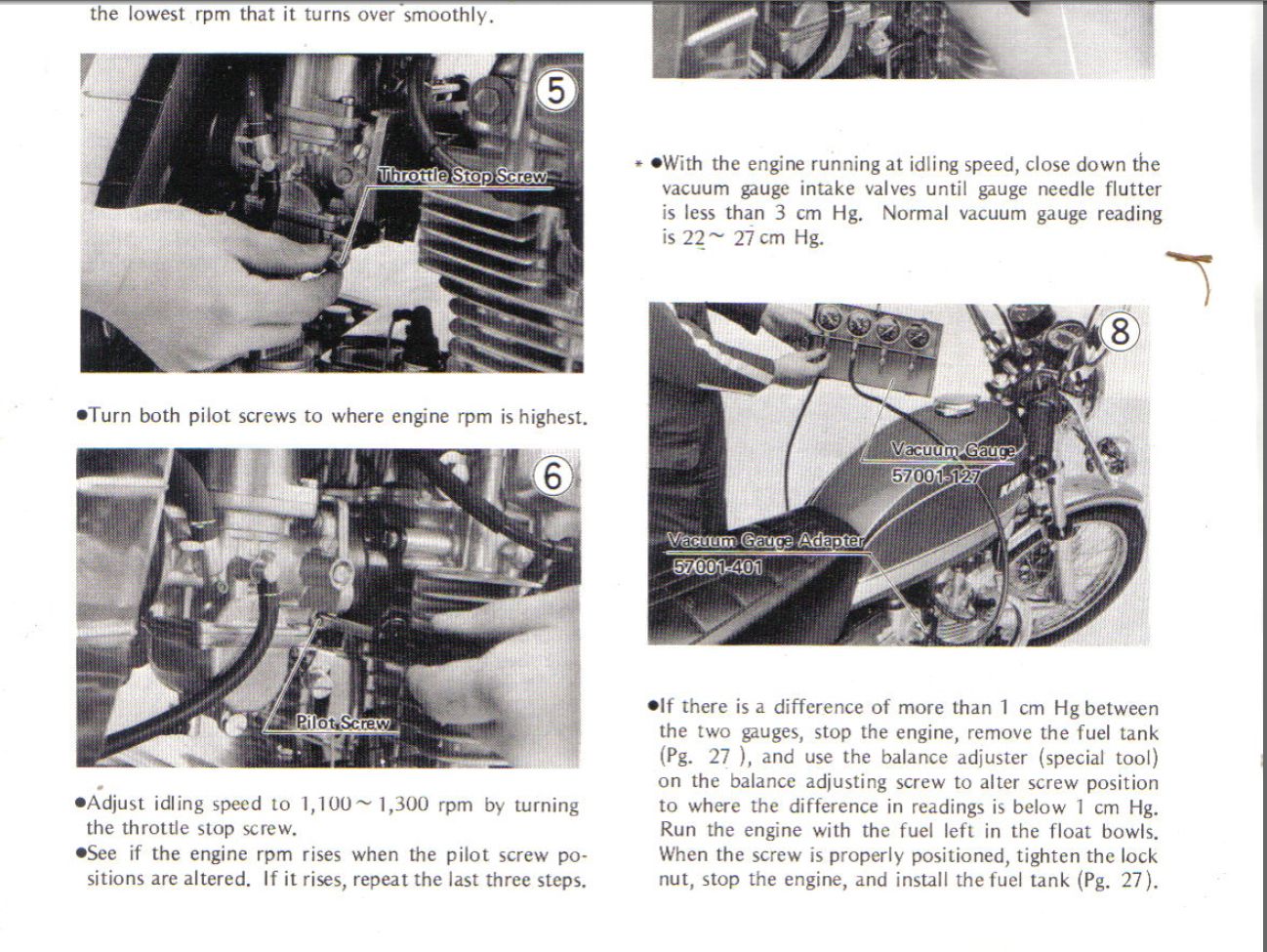 1st get the carbs properly synched both cables and slide idle stop screw (see below).