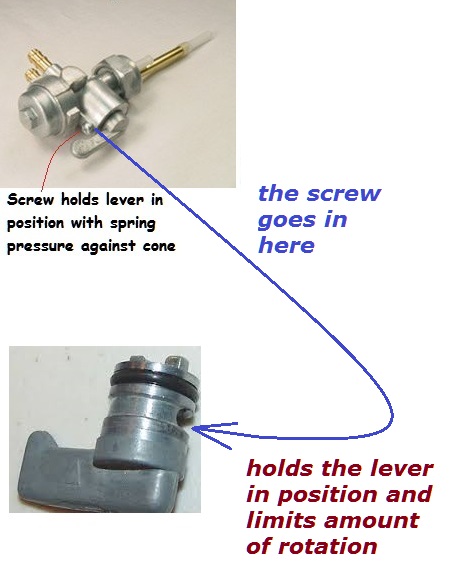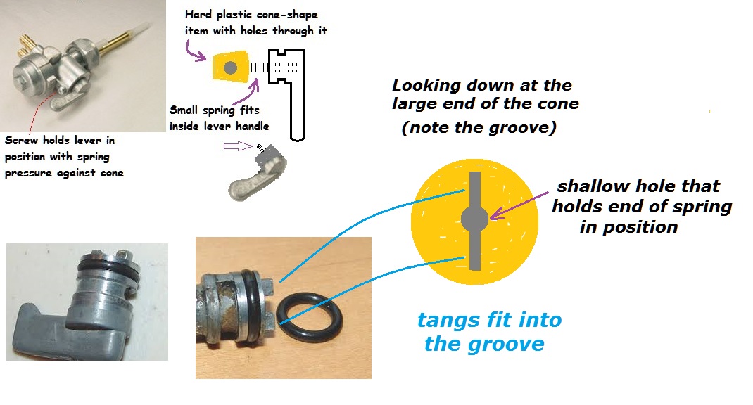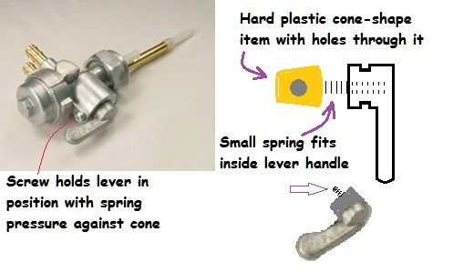 Manual (non-vacuum) petcock drawings in the manuals are sometimes incomplete because they don't show the separate cone-shaped part, spring and handle. Here's an example, where it looks like the handle/spring/cone is all a single component: