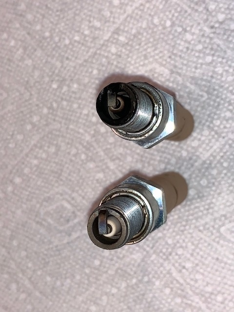 Okay, I managed to take the KZ-1000 out for an all too brief ride today. It hit 50 degrees for the first time in what seems like an eternity so off I went. Anyway the bike runs pretty good, except sometimes when taking off or making a tight turn. It seems to stumble a bit before it will "go". I wasn't getting on the gas hard, just normal stuff. Otherwise the bike ran really well for the most part, but I never really got on it with all the junk on the road surface. When I got home I pulled the plugs to look at them and cylinders 1 and 2 were pretty sooty. Cylinder 3 and 4 looked really good to my eyes. So in my estimation, cylinders 1 and 2 are running rich and I should lean them out a bit by turning the fuel mix screw in a bit correct? Should I leave 3 and 4 alone? The picture below shows two plugs and they are representative of the other two. Thanks for any suggestions. Now I can put the bike in dry dock for a couple of months again.
