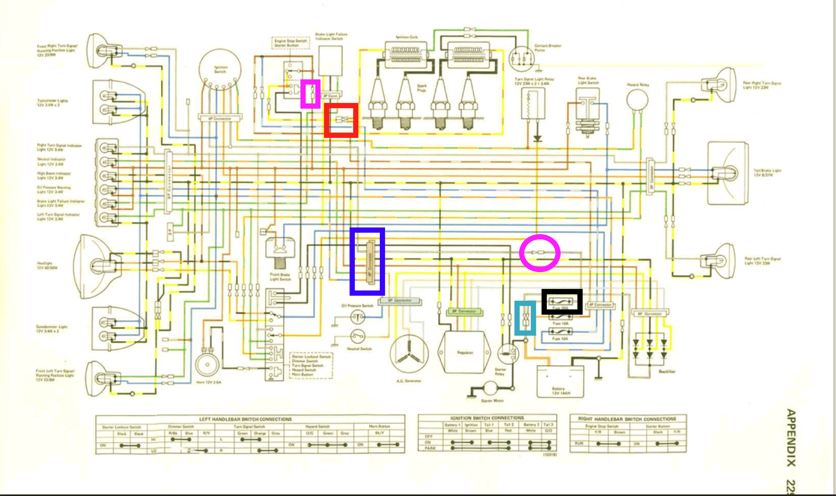 OK got the bike running and it runs 100% better than before the carb cleaning! Here is what I found: Like F64 suggested, I left the light circuit fuses out and put in only the main 20 amp fuse. Still no spark. I took the points cover off to see if the points were sparking, and they were not opening hardly at all and not sparking. I regapped them to 0.014" (screws were extremely tight, so doubtful they moved), sprayed a little ether in the carbs and the bike fired briefly. Reinstalled the tank and turned on fuel, wouldn't start. Then remembered there was very little gas in the tank so put it on RES and it fired right up, smoked a little as the oil burned off the header, and settled in at about 2,000 rpm. Adjusted idle down to 1,000 rpm, runs great now without even syncing the carbs yet. I am wondering if the point brackets (not sure what they are called) wore down to were the points weren't opening enough? There is no grease on the cam that lifts the points. I don't have any "points grease", I will get some this morning when I go to get the correct fuses. BTW, I did find one fuse was marked 20A and all three fuses looked the same, so it looks like the lighting circuit fuses were replaced with 20 amp fuses to keep them from blowing. So I still need to track down the issue with the lighting circuits. THANKS to everyone for their input on my problem!