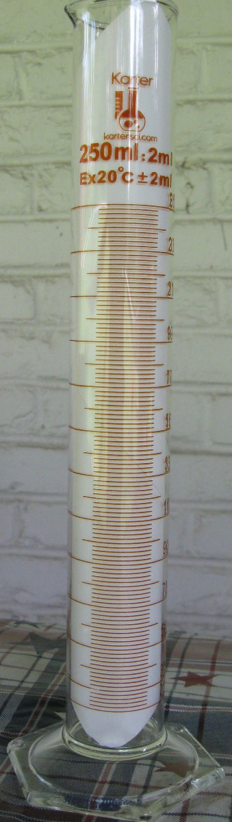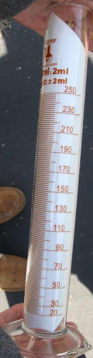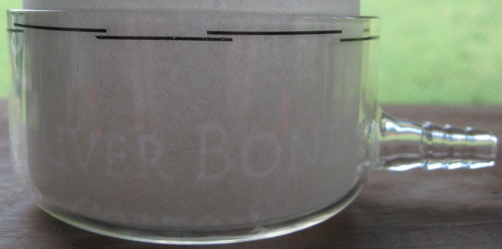 A cup with drain barb that has green, dashed, offset calibration lines at 3mm and 4mm was commissioned from the glassblower. We spec’d the cup with dashed green calibration lines this time, as black is difficult to see against the fluid meniscus under some shop lighting conditions. The 1mm vertical offsets help with accuracy. This image shows a sheet of white plastic sheet foam inserted for contrast: