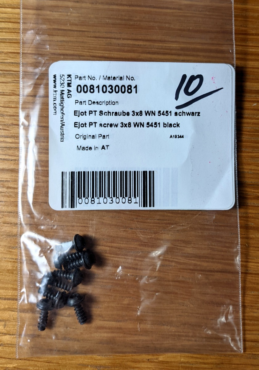 I found something that will work in place of the factory screw. It's at least the right type of screw. It's a KTM part, part number 0081030081. I got them for $0.19 each.