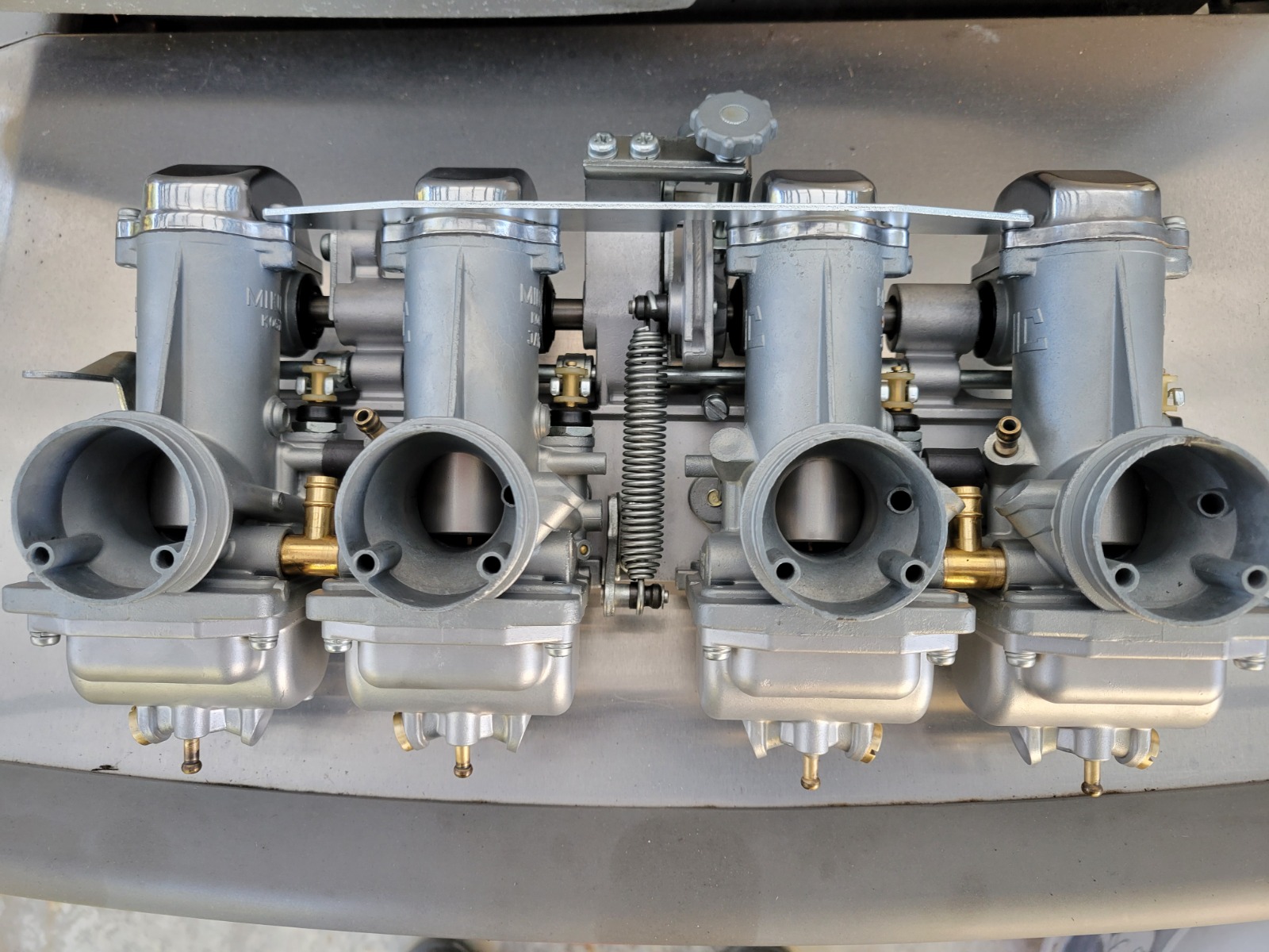 Set two are some early VM26's, the version with the plate that joins the carbs across the top caps. '77 I think, or close. This set is one of the cleanest I've ever purchased. The O-rings were crumbling, but there was NO varnish inside whatsoever, and very little corrosion. I just finished bead blasting them, and it was a MUCH easier job than most other sets I've done. Stay tuned for photos in a few days.