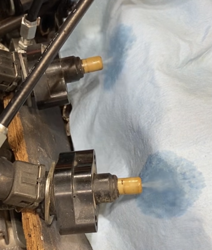I looked at my video clip and ran it in slo mo, I noticed the mist varies with each squirt, here are 4 pics 2 from each pair cyl 1/2 and cyl 3/4. One squirt is heavy and one is finer. That could be the computer changing the cycle duration, many squirts are not visible into the paper towel but then you see one or 2 that are heavier. I still need to do the jar test mentioned in a prior post.