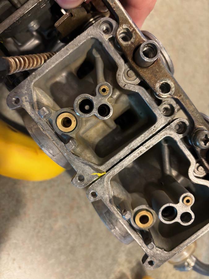 When I got the bike (non-running) I pulled the carbs off the bike. Very clear PO took the carbs off the bike and 100% dismantled them. Then tried to put them back together. Yellow plumbing tape evident at carb joints, spacing is weird. He has one carb marked #1 which is is #2 on the rack. When I pulled them from the bike I could hear small springs hitting the ground from the rack of carbs.