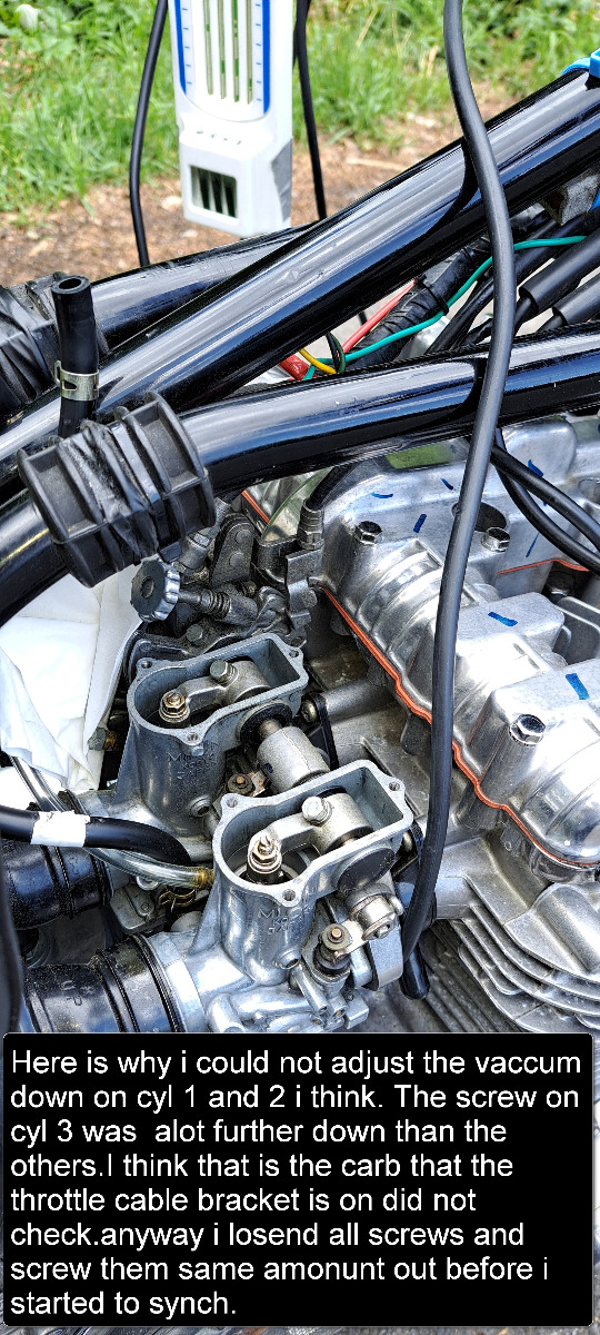 the idle screw has to be unscrewed to get the carb 3 lid off but that is easy and just put the idle screw back in again when synching. Then did a short ride and the vibration around 2700rpm is gone and engine feels smooth,but now the engine bogged/burped a little when opening throttle fast so will have to adjust more on the mixture screws again and again and again .This green lady really want things her way haha.