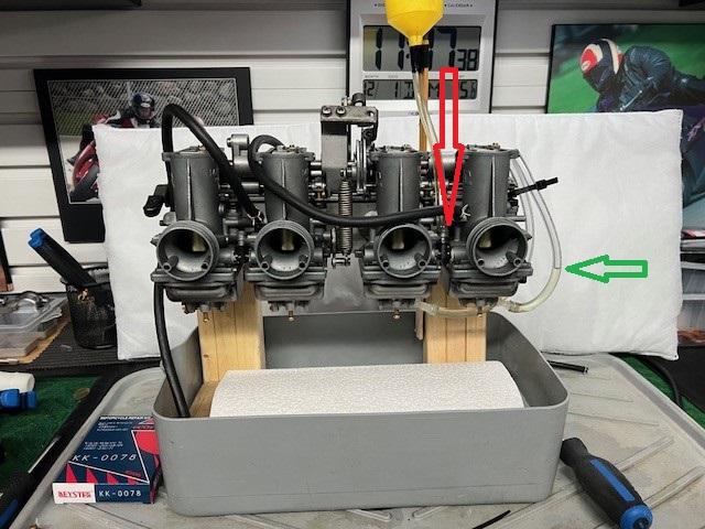 But I still have an issue with carb # 4 : When the gas goes in the bowl, the clear tube stop rising at some point (valve close I guess) then slowly rise app 5 mm / 1/4''. Last time I tried, it leaked by the over flow.