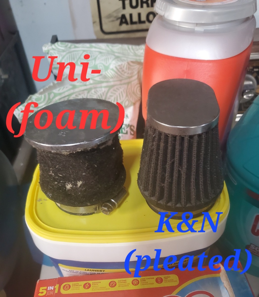 27 May 2025 13:55Both the UNI (which is foam) and the K&N (pleated) are reusable, that is you can wash them, oil them and go. Having used both types, I prefer the K&N or APE over the foam UNI. Here's a very dirty example of both