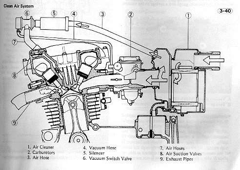 You also mention the clean air system that bikes intended to be sold in the US had. I have included a pic (it is for the 550 bikes) that shows how it plays into this. If your machine has such it would be much the same.