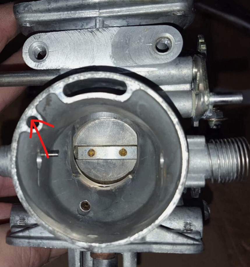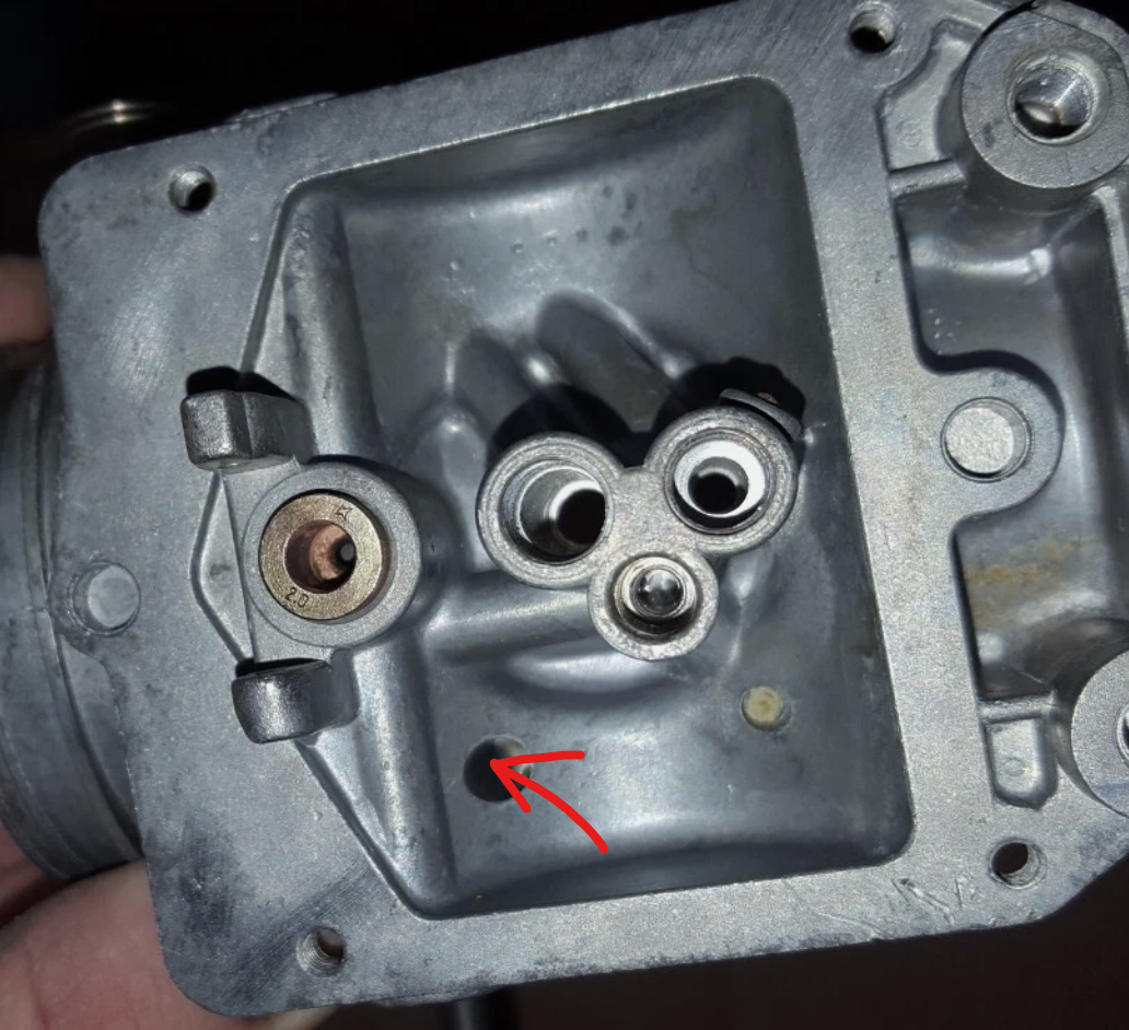 First, look at the carb body. There is only one hole in the body, from the float chamber. Put your carb can spray nozzle in this hole and shoot. It will come out the passage on the inlet side of the carb. This is the vent passage. It's very simple to see.