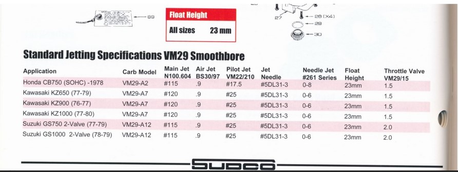 The 29s are VERY VERY similar to the 76/77 KZ900A/B VM26s... same needle jet size, same jet needle size, same slide cut out and the main and pilot jets should be REAL close. The 76/77 VM26 was a bit too rich when back in the good ol' days, the EPA didn't notice. Those carbs will allow a bike to start with little or no choke and you can change to most any pipe without a flat spot.