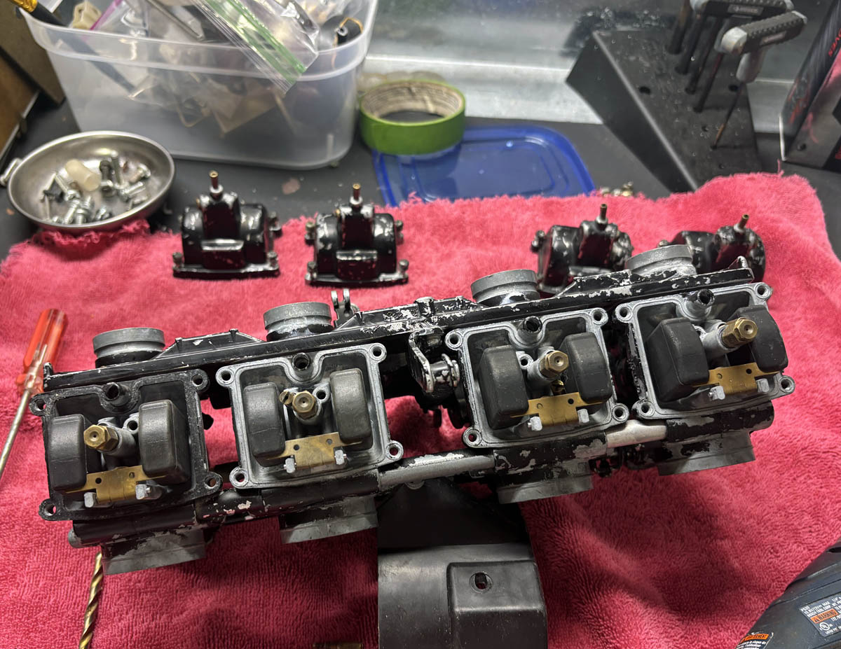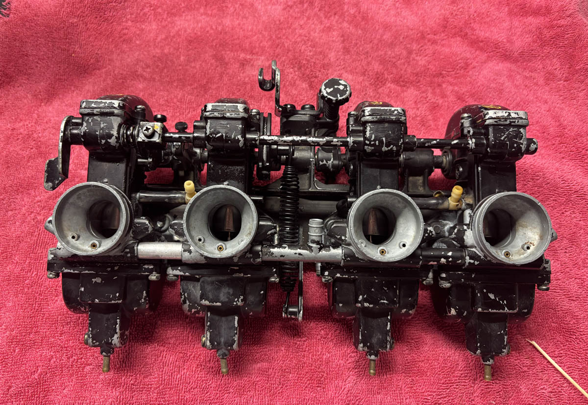 I bought a set of 1981 GPz550 carbs. They have arrived and while they look like they barely survived Dresden they look pretty good and are seemingly clean inside. I pulled all the jets out of them and dropped them off with my guy with a pro-level ultrasonic cleaner. I was gonna pull the top ends off and get the emulsifier tubes out but I lost motivation and gave them to him.
