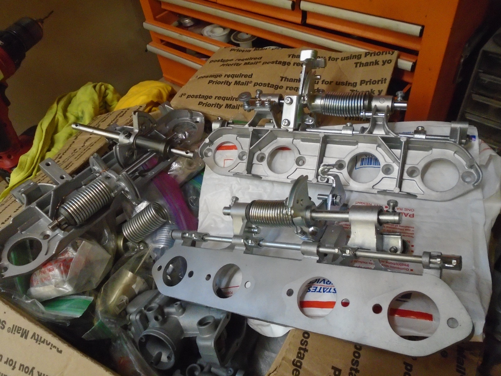 If anyone Needs presentable crap for their restoration, cleaned-up and plated bits for the 1974 and 1975 carb 2170's entertain yourself with this option. I've boxes and Tupperware containers full of this stuff. Won't mention the name of the Member who HELPED me Tremendously putting the icing on the cake for hardware refurbish on a couple of these but he doesn't want the notoriety. Anyhoot, this stuff will save you time and stave off greasy finger syndrome having to knock off the funk of yours. Have WAAAY more then pictured, even complete sets. Pictured in last photo is the Pulley Wheel difference. 1975's started using Aluminum, earlier Steel. PM me for details, Clay